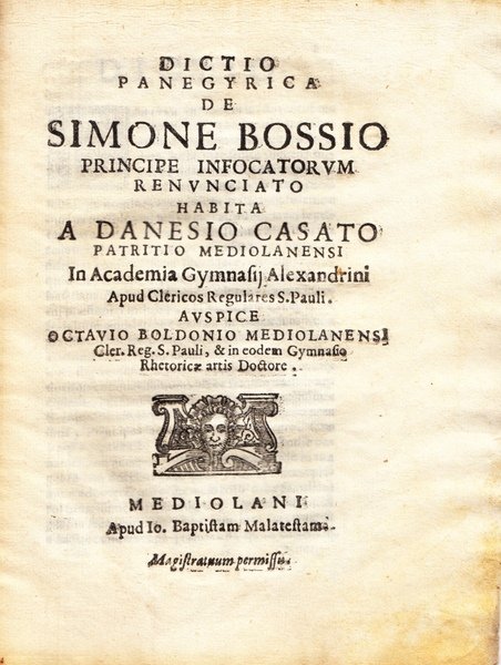 Dictio panegyrica de Simone Bossio principe infocatorum renunciato habita a Danesio Casato patritio mediolanensi in Academia Gymnasij Alexandrini apud clericos regulares S. Pauli. Auspice Octauio Boldonio mediolanensi cler. reg. S. Pauli, & in eodem Gymnasio rhetoricae artis doctore. Danesio Casati. Giovanni Battista Malatesta.