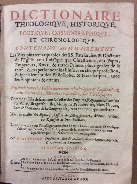 DICTIONAIRE THEOLOGIQUE, HISTORIQUE, POETIQUE, COSMOGRAPHIQUE ET CHRONOLOGIQUE. - Contenant sommairement les vies plus remarquables des SS. Patriarches & Docteurs de l'Eglise, tant Iudaique que Chrestienne, des Papes, Empereurs, Roys, & autres Princes plus signalez de la terre, & des personnes plus illustres en chaque profession, & specialement des Philosophes & Heresiarques, avec leurs opinions & erreurs. Sixiesme edition.
