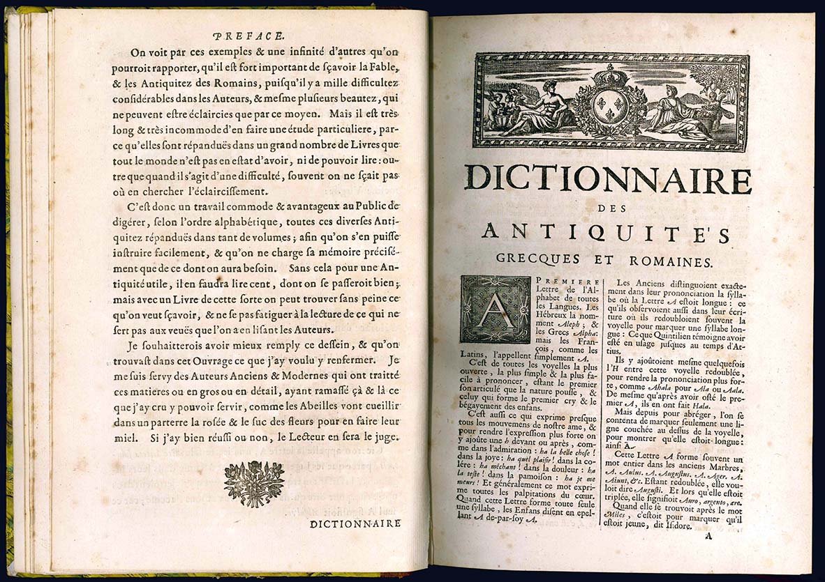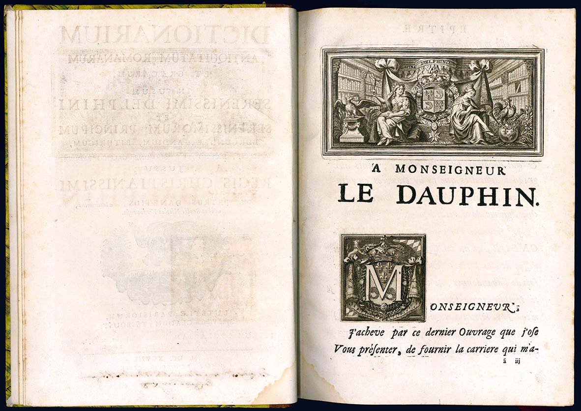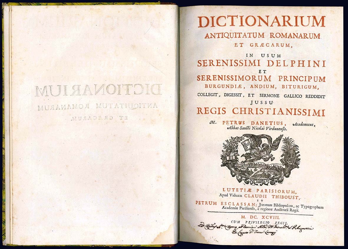 Dictionarium antiquitatum romanorum et graecarum, in usum serenissimi Delphini et serenissimorum principum Burgandiae, Andium, Biturigum, collegit, digessit, et sermone gallico reddidit jussu regis christianissimi.
