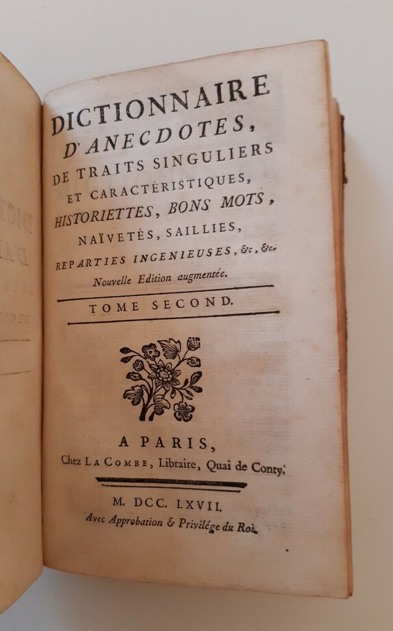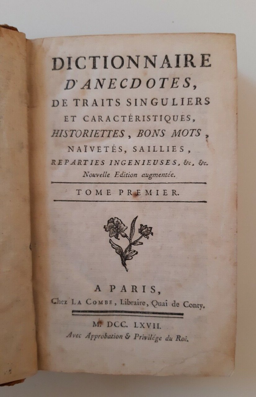 DICTIONNAIRE D'ANECDOTES DE TRAITS SINGULIERS ET CARACTERISTIQUES LA COMBE 1767
