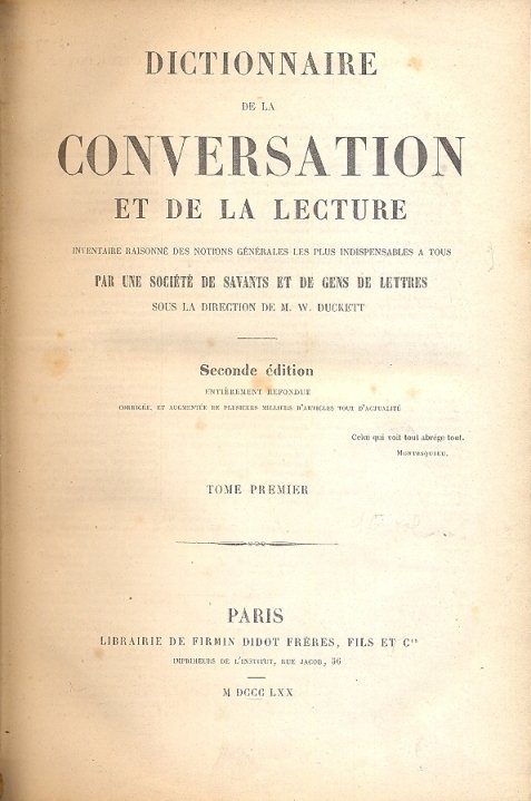 Dictionnaire de la Conversation et de la lecture. Inventaire raisonne des notions generales les plus indispensables a tous par une societe de savants et de gens de lettres . Sous la directione de M. W. Duckett.