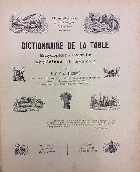 In-8 gr. (mm. 275x225), mz. tela coeva, pp. 483,(5), testo su due colonne, ben illustrato da numerosiss. figure nel testo, per lo più xilografate. Dalla prefazione: Il en résulte que ce dictionnaire peut etre, à la fois, un guide médical éclairé, pour les gourmands ou les simples mangeurs, et un délassement littéraire, pour les gourmets ou les gens condamnés à la diète. Dans les deux cas sa lecture sera utile, soit qu'elle ait enseigné, soit qu'elle ait seulement récréé. Esemplare ben conservato.