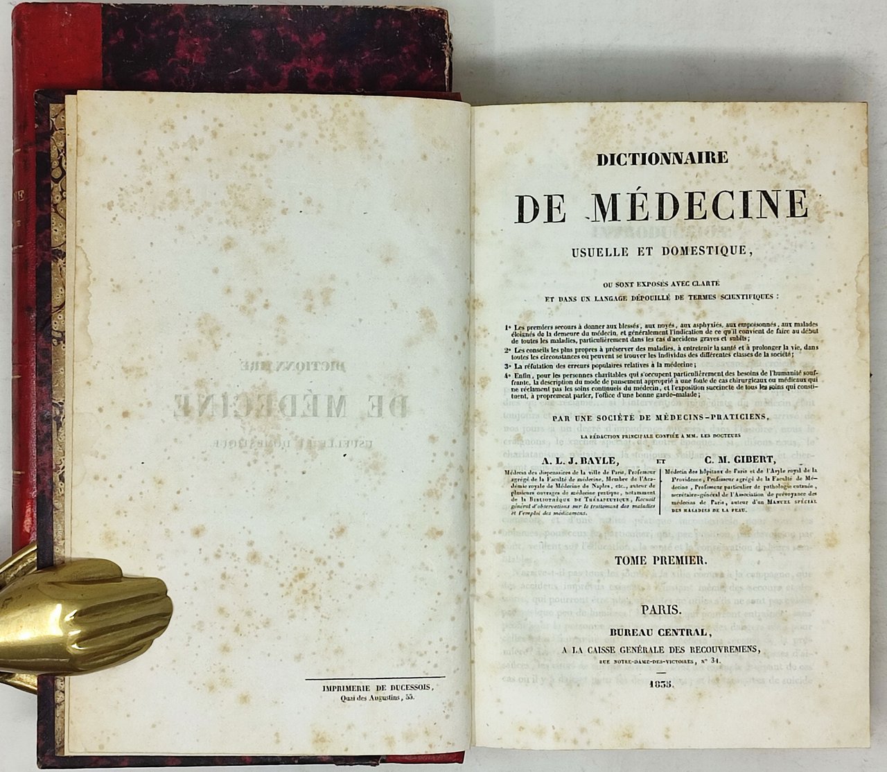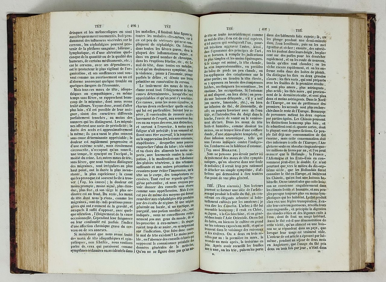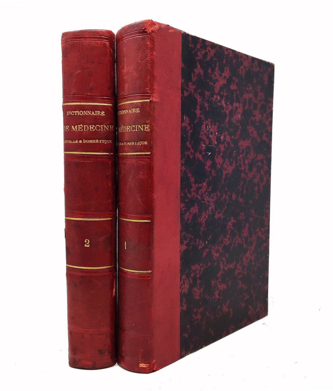 Opera completa in due tomi (il primo volume termina con la lettera 'F' e il scondo inizia con la 'G'). Prima edizione di questo dizionario. Formato: 16,5 x 26,5 cm circa. Stato di conservazione: qualche leggera e superficiale abrasione sui margini delle copertine; diffusi ingiallimenti / brunature dalla carta (in special modo sul tomo I che presenta anche qualche pagina uniformemente brunita ma perfettamente leggibile); leggera tendenza degli ultimi due fogli del tomo 2 a staccarsi dalla rilegatura; un piccolo alone (probabilmente causato da una pregressa umidità) sul margine bianco superiore della prima trentina di pagine del tomo secondo (difetto davvero minimo e appena visibile) ma, nel complesso, due esemplari buoni. privi di scritte o sottolineature. Nessuna firma d'appartenenza. Nessun timbro. Opera scientifica esaustiva e ben organizzata che riporta termini appartenenti al campo dell'igiene, della medicina, della storia naturale, della farmacia e della chirurgia. Molto curioso il fatto che, nell'indice, ci sia una sezione dedicata agli 'erreurs populaires' con richiami ai pregiudizi relativi alle varie voci riportate nella trattazione. Di non facile reperimento in questa edizione originale.
