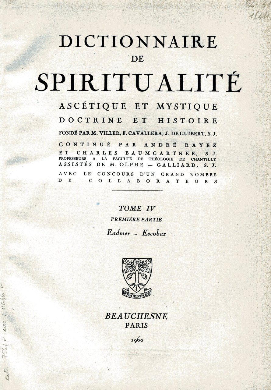 Dictionnaire de spiritualité. Ascetique et mystique, doctrine et histoire avec le concours d'un grand nombre de collaborateurs. Tome IV, Première Partie. Eadamer - Escobar