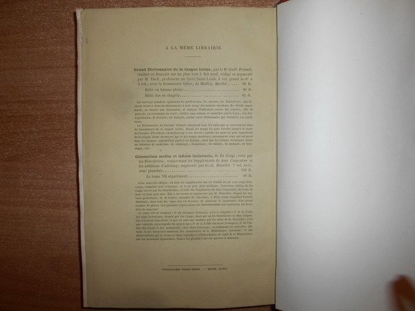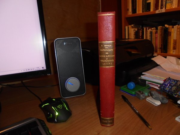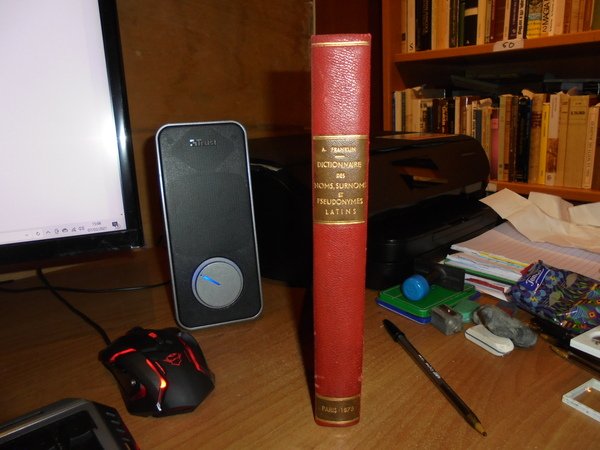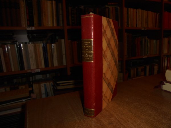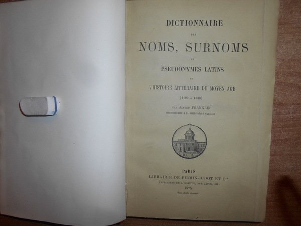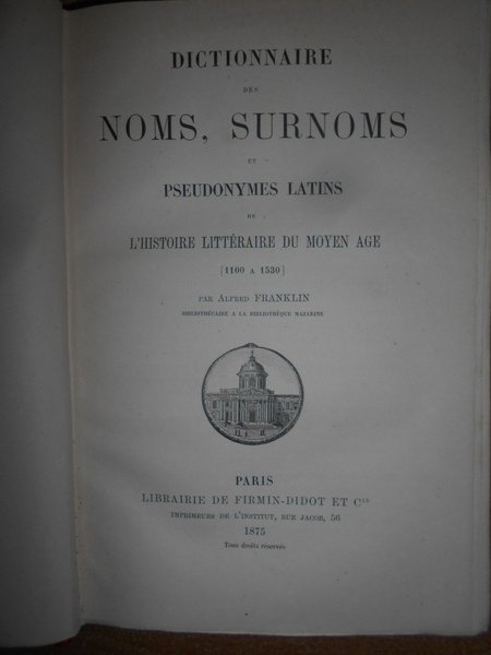 ALFRED FRANKLIN. Paris, Librairie de Firmin-Didot et Cie, 1875. DICTIONNAIRE DES NOMS, SURNOMS ET PSEUDONYMES LATINS DE L'HISTOIRE LITTÉRAIRE DU MOYEN AGE (1100 À 1530). In-8° grande, m. marocchino rosso con larghe punte, titolo in oro entro tassello al dorso, copertine originali conservate. X, 683 pp. numerazione per colonne. Perfetto esemplare in prima edizione con legatura di pregio e copertine originali conservate. Uff. B - II - 1