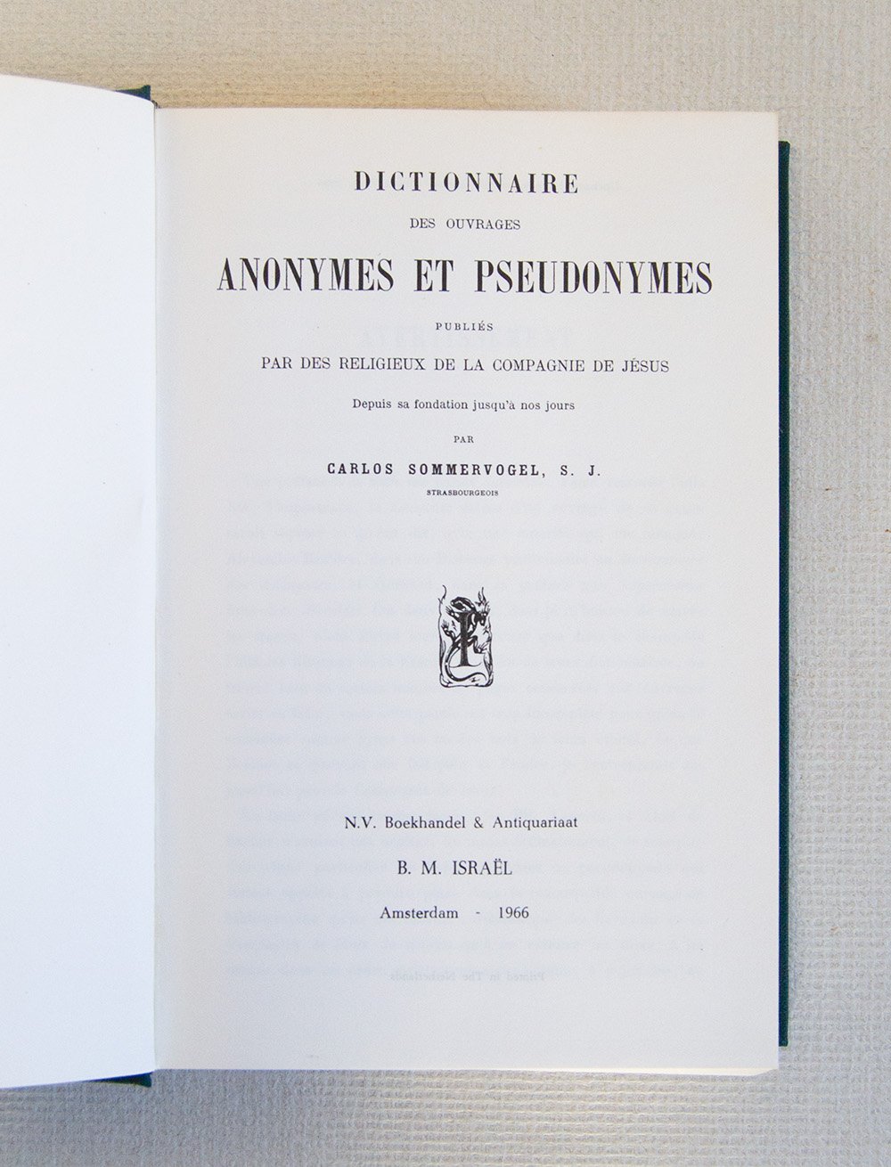 Dictionnaire des ouvraages anonymes et pseudonymes publié par des religieux de la Compagnie de Jésus depuis sa fondation jusqu'à nos jours.