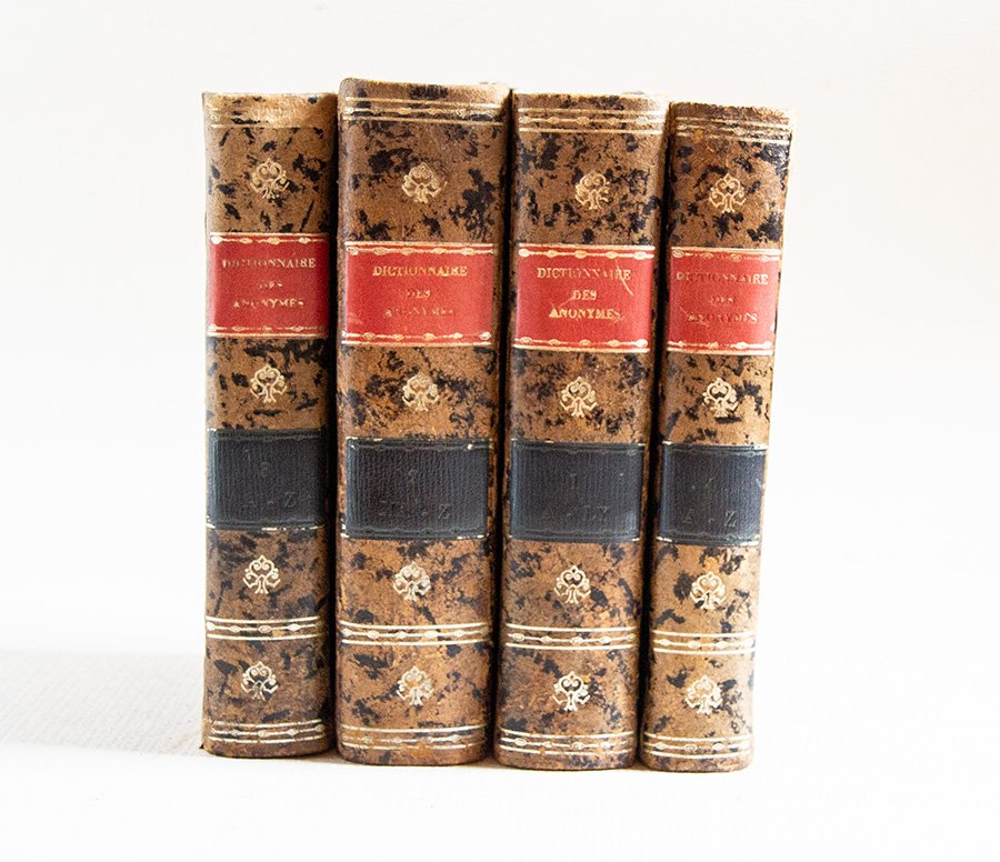 Bazzana coeva con doppio tassello al dorso. Ottimo stato. 4 voll. PRIMA EDIZIONE. (4), 522 pp.; (4), 678 pp.; (4), 560 pp.; (4), 437, (2), LV pp. Utilissimo repertorio che identifica i veri autori di ben 12403 opere anonime e pseudonime pubblicate in francese e in latino. Con numerosissimi rimandi che identificano altre opere dei singoli autori e utilissimi indici alfabetici degli autori e dei loro pseudonimi, la consultazione è agevolata ed assistita.