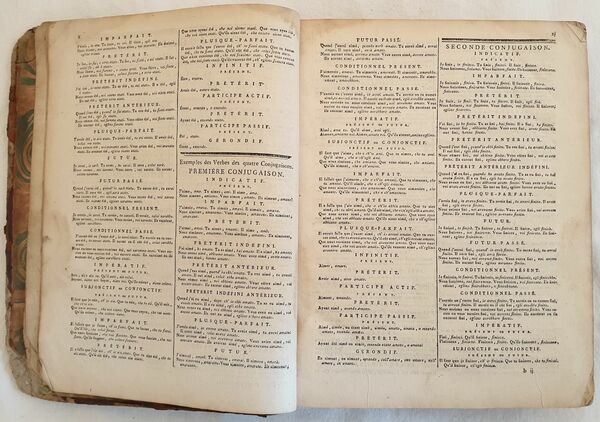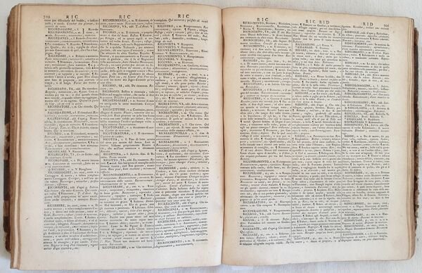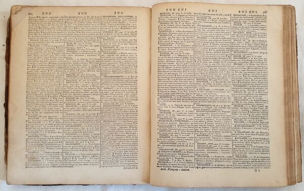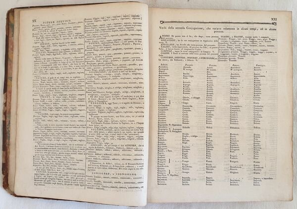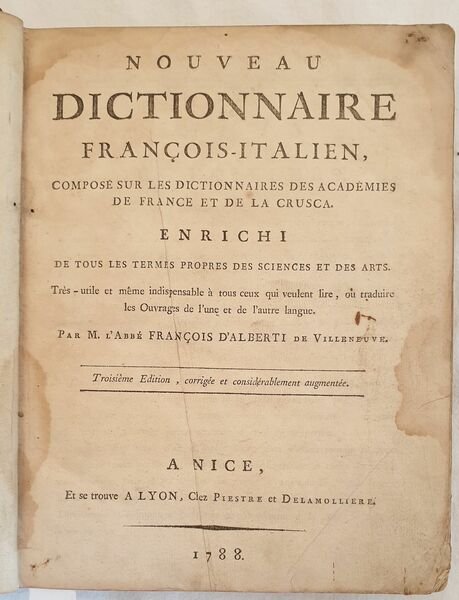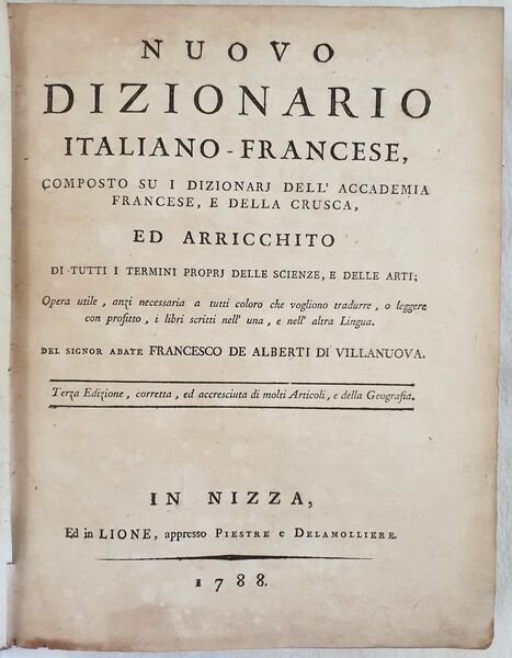 Edizione del 1788 di questo dizionario francese italiano e italiano francese composto sui dizionari dell'Accademia francese e della Crusca scritto da Alberti di Villanuova. Arricchito delle parole utilizzate nelle scienze e nelle arti. L'opera è in due volumi ed è completa sebbene le pagine iniziali V e VII. In discrete condizioni. Copertina in piena pelle coeva in discrete condizioni generali con usure e parti mancanti ai margini e dorso. Le due legature sono differenti. Piatti in parte staccati. Legatura in buone condizioni. All'interno le pagine si presentano in buone condizioni con fioriture. Qualche lieve gora d'umidità marginale al tomo primo. In 8. cm 26,5x21. pp. XVI+971+(1), XXIV+1008. Peso Kg. 4 Edition of 1788 of this italian french and french italian dicitionary written by Alberti di Villanuova. Edition enriched with terms of science and art The work is in two volumes and it is complete even if initial pages V and VII lack. In fair conditions. Leather coeval cover in fair general conditions with wearings and losses in the edges and spine. The two covers are different. Plates are partially detached. Binding in good conditions. Inside pages are in good conditions with foxing. Some dump stain in the edges of the first tome. In 8. cm 26,5x21. pp. XVI+971+(1), XXIV+1008. Peso Kg. 4