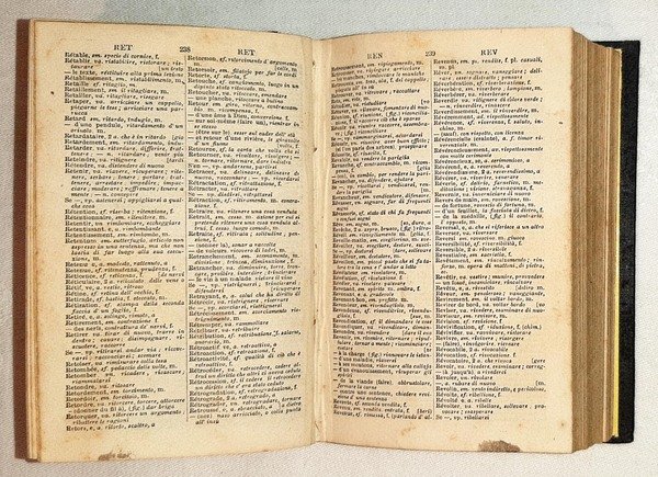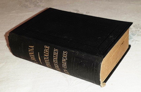 in-12°, 116x78 mm, leg. editoriale in tela nera con impressioni e titolo dorato al dorso; pp. 304; 414. Opera pubblicata presumibilmente nel 1880-1890, comprendente la parte Francese-Italiano e quella Italiano-Francese. Rif.: IT\ICCU\BVE\0727494. OCLC, 484168012. Cond.: Esemplare in condizioni quasi ottime.
