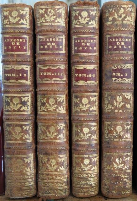 Barret, Lyon, 1771. Opera completa in 4 voll. in 8vo, pp. XVI, 623; (2); 592, (2); 626, (2); 621, (3), testatine e capilettera ornati, leg. coeva p. pelle nocciola con dorsi a nervetti adorni di titolo e tomaison in oro su doppio tassello, fiorellini e decori vegetali in oro entro scomparti, contropiatti e fogli di guardia in carta marmorizzata policroma, tagli marmorizzati. Edizione originale di questo ampio dizionario biografico degli uomini celebri, comprendente 550 articoli disposti in ordine alfabetico e compilato per cura del Bonnegarde, il quale si basò sul celebre "Dictionnaire" del Bayle e su quello dello Chaufepié, il "Nouveau Dictionnaire historique et critique pour servir de supplement ou de continuation au Dictionnaire historique et critique de Pierre Bayle". Esemplari con normali sciupature del tempo alla legatura (come gli angoli scoperti e il volume IV che presenta delle abrasioni della pelle al piatto posteriore), peraltro molto ben conservati all'interno.