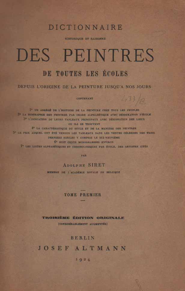 In-8 gr., 2 volumi, mz. pelle coeva, dorso a cordoni con fregi e titolo oro, tagli rossi, pp. XVIII,(2),568; (4),481,LXXXIII; ben illustrato da numerosiss. tavole in bianco e nero fuori testo che riproducono opere dei più importanti pittori. Vi sono contenuti: 1° Un abrégé de l'histoire de la peinture chez tous les peuples - 2° La biographie des peintres par ordre alphabétique avec désignation d'école - 3° L'indication de leurs tableaux principaux avec désignation des lieux ou ils se trouvent - 4° La caractéristique du style et de la manière des peintres - 5° Le prix auquel ont été vendus les tableaux dans les ventes célèbres des trois derniers siècles y compris le dix-neuvième - 6° Huit cents monogrammes environ - 7° Les listes alphabétiques et chronologiques par école, des artistes cités. Pagine ingiallite per la qualità della carta, altrimenti ben conservato.