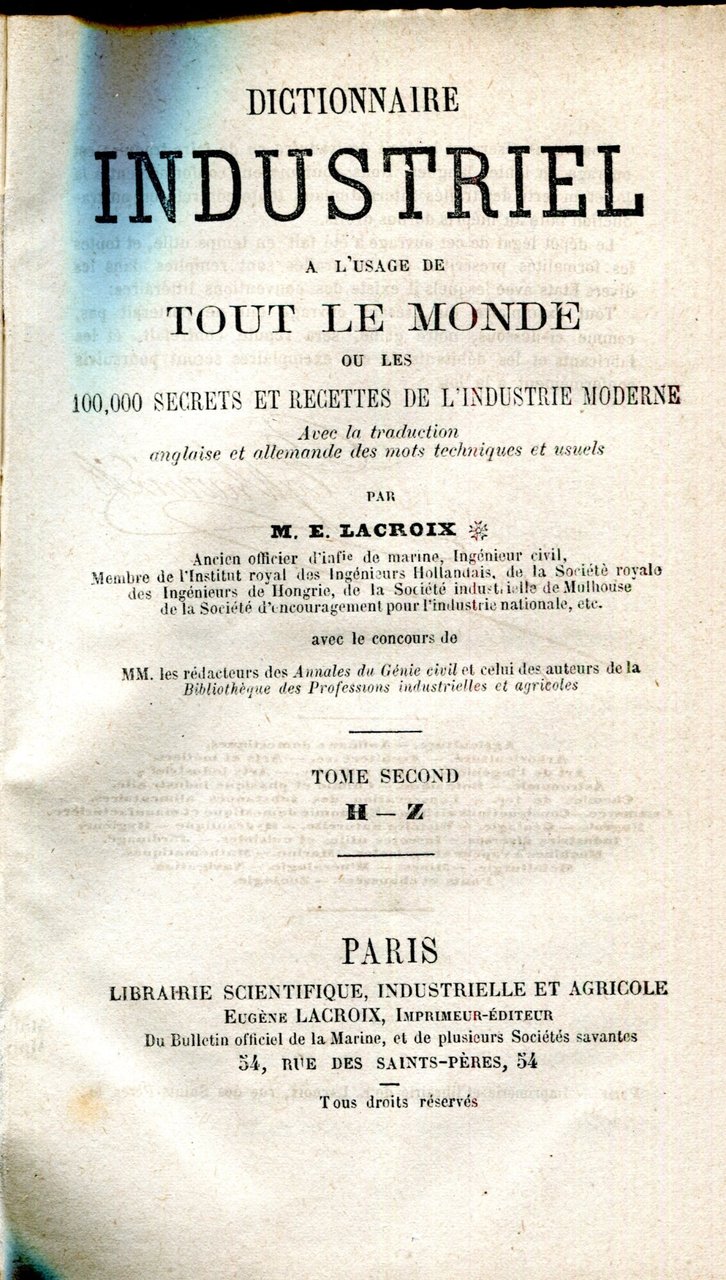 Dictionnaire Industriel à l'usage de tout le monde ou les 100.000 secrets et recettes de l'Industrie moderne. Avec la traduction anglaise et allemande des mots techniques et usuels. Avec le concours de MM. Les rédacteurs des Annales du Génie civil. Tome premier, A-G, et second, M-Z.