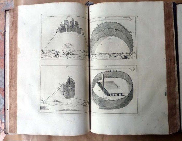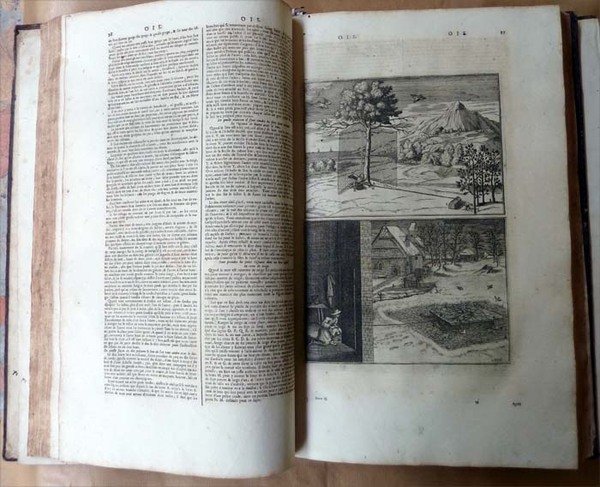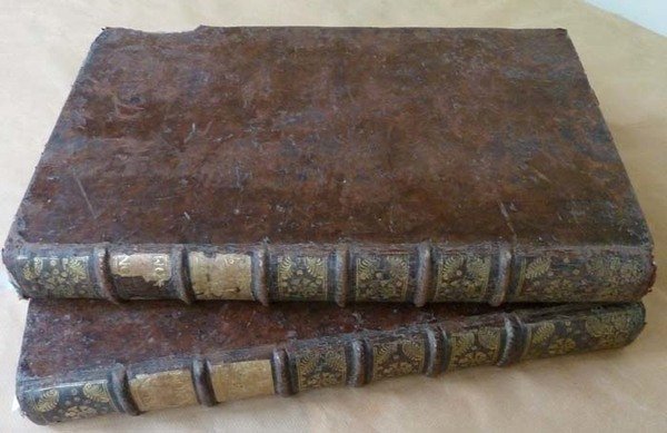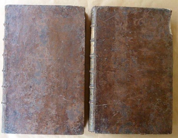 Ensemble de deux forts volumes de format in folio de TomeI: 6 ff. (titre; avertissement; avis; stances irrégulières; privilège et Dédicace); 424 pp.; très nombreuses gravures sur bois dans le texte; une planche hors texte; pour le tome II: 1 f. (titre); 400 pp.; très nombreuses gravures sur bois; 9 planches hors texte. Reliure de l'époque en plein veau croûté; dos à 6nerfs, ornés, dorés; pièces de titre et de tomaison dorées. Au T.I, Il manque les pièces de titre et de tomaison; manque sur le premier plat en bordure; coiffes usées; coupes et coins usés; rares rousseurs dans le corps du texte qui est très frais; au T.II, angles et coupes légèrement frottés; intérieur frais; bel état. Ensemble bien relié. Voir les photos.