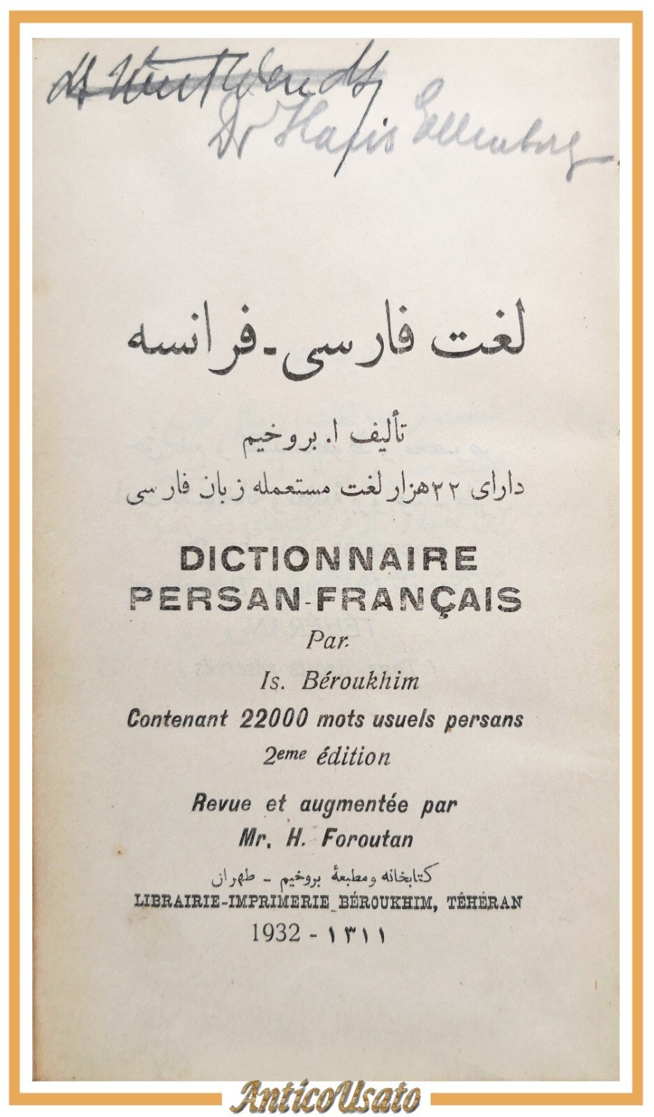 DICTIONNAIRE PERSAN FRANCAIS di Béroukhim 1932 Librairie Imprimerie Libro