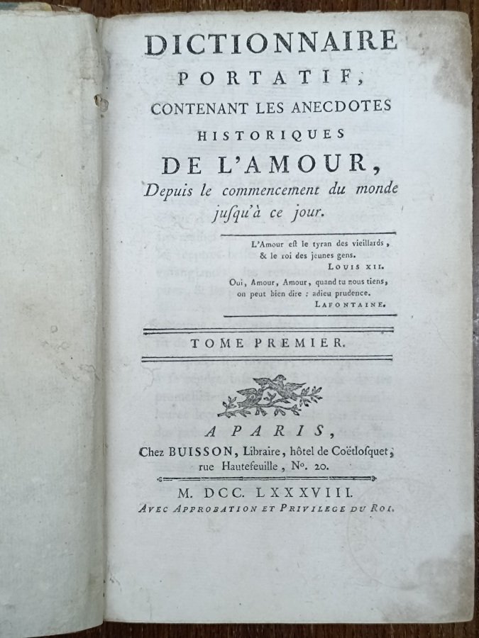 Dictionnaire portatif, contenant les anecdotes historiques de l'Amour, depuis le commencement du monde jusqu'à ce jour.