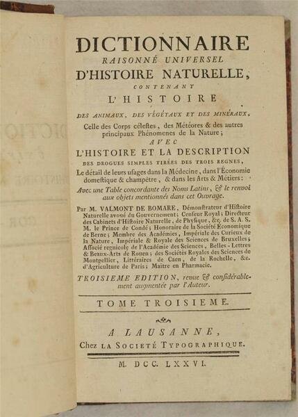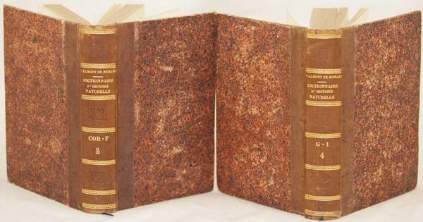 In 8. Dim. 19x12,5 cm. Pp. (4)+623+(1), (4)+617+(1). Edizione del 1776 di questo dizionario ragionato di storia universale del naturalista francese Jacques Christophe de Valmont Bomare (1731-1807). L'autore dopo i suoi studi in anatomia venne affiancato da celebri natualisti come il Buffon, Daubenton, Reaumur, Nollet, Rouelle, D'Holbach, D'Alembert e Diderot. Il suo dizionario naturale pubblicato per la prima volta nel 1764 venen tradotto in molte lingue diventando quasi un best-seller dell'epoca. Questa edizione era composta da nove volumi, siamo purtroppo in possesso solo del terzo e quarto contenente le lettere COR-IZQ. All'interno nozioni di zoologia, botanica, minerali, astronomia, descrizione di droghe semplici utilizzate in medicina, economia domestica e campestre, arti e mestieri (es. coralli, coriandolo, uccelli e insetti, cristalli, furetto, frutta, acque, confetti di Tivoli, ginseng, nicotiana, Circoncisione, infibulazione e castrazione ecc.). Bella legatura in mezza pelle ottocentesca con titolo e decorazioni in oro al dorso. In ottime condizioni e completi Copertina in mezza pelle con titolo e decorazioni in oro al dorso in ottime condizioni generali con lievi usure ai margini e dorso. Legatura in ottime condizioni. Pagine si presentano in buone condizioni con fioriture. Segno di tarlo al margine inferiore da pag. 331 a 378 con lieve perdita di testo da pag. 333 a 376. Edition of 1776 of this reasoned dictionary of universal history by the french naturalist Jacques Christophe de Valmont Bomare (1731-1807). the author after studying human anatomy was helped by famous naturalists as Buffon, Daubenton, Reaumur, Nollet, Rouelle, D'Holbach, D'Alembert and Diderot. His natural dictionary firstly published in 1764 was translated in different languages becoming a sort of best-seller for that time. This edition was made up of nine volumes, unfortunately we only have the third and fourth tome containing letters COR-IZQ. Inside notions of zoology, botany, minerals, astronomy, description of simple dryges used in medicine, home economy, arts and jobs (es. corals, coriander, birds and insects, crystals, fruit, water, confetti di Tivoli, ginseng, nicotiana, Circumcision, infibulation and castration ecc.). Beautiful half leather cover of XIX century with golden title and decorations in the spine. In very good conditions and complete. Half leather cover of XIX century with golden title and decorations in the spine in very good general conditions slightly worn in the edges and spine. Binding in very good conditions. Inside pages are in good conditions with foxings. Worming in the lower edge from pag. 331 until 378 with slight loss of text from pag. 333 until 376.
