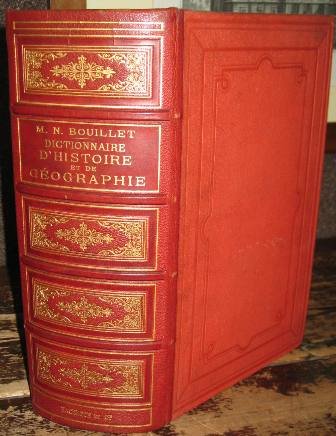 In-4° piccolo, pp. VII, 2144, splendida legatura ceva m. pelle rossa con titolo, filetti e fregi ornamentali in oro al dorso. Piatti in percallina rossa con filettature e decori impressi a secco. Sguardie marmorizzate. Testo bicolonne. Una dedica primonovecentesca. Ottimo stato. Amplissimo dizionario storico, geografico e mitologico moltissime volte ristampato, qui rifuso e riveduto per le cure del Gourraigne. La prima edizione è del 1842. Il Bouillet (Parigi, 1798-ivi, 1865) fu poligrafo, professore di filosofia, ispettore generale della pubblica istruzione, traduttore di opere greche e latine.