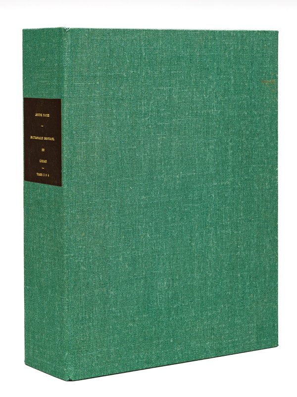 2 vol. in-4 br. sous emboîtage postérieure pleine toile verte, Librairie-Imprimerie des Halles et de la Bourse de Commerce, Paris, s.d. [ circa 1883 - 1884 ], Tome 3 : Tome 4 : 2 ff., pp. 949-1425 et 5 ff. n. ch. ; Tome 4 : 2 ff., XL pp., pp. 1429-1940 et 3 ff. n. ch. Un amateur gastronome a conservé sous un étui d'excellente facture les deux derniers tomes, débrochés et sans leur dos, de l'important dictionnaire de Joseph Favre. Prix en l'état (les volumes sont totalement débrochés, qq. travaux de poissons d'argent en marge de rares feuillets, l'étui est en parfait état). Cf Vicaire, 356