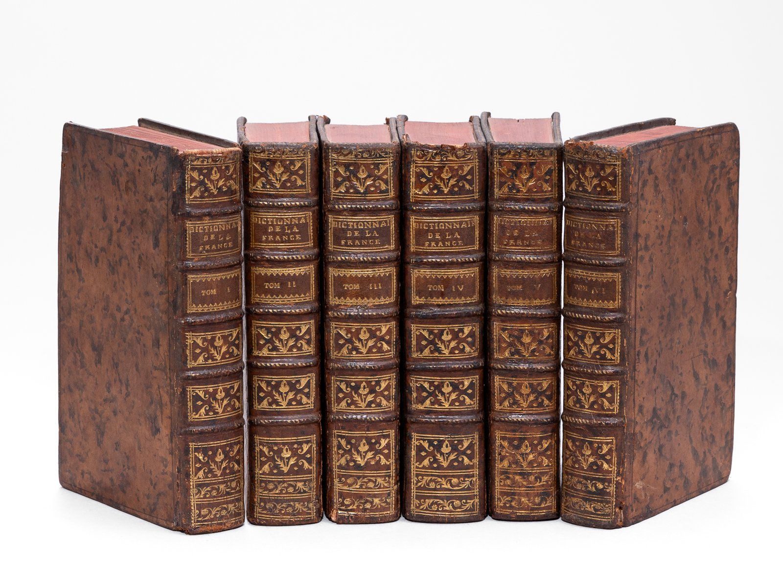6 vol. petit in-8 reliure de l'époque plein veau marbré brun, dos à 6 nerfs doré orné, Chez Desaint, à Paris, 1771, XVI-664 pp. ; 2 ff., 680 pp. ; 2 ff., 675 pp. ; 2 ff., 714 pp. ; 2 ff., 659 pp. ; 2 ff., 645 pp. et 2 ff. n. ch. Bon état pour cet exemplaire bien complet de l'édition originale. Né en 1732, Mathias Robert de Hesseln a également laissé des ouvrages de cartographie et de topographie. Il reste connu notamment pour la proposition qu'il fit en 1780 de découpage administratif de la France par quadrillage, en 80 carrés de 18 lieues de côté. Si l'idée fit alors scandale, elle inspirera les révolutionnaires lors de la création des départements. La bibliographie de l'Ined évoque un "guide donnant un aperçu excessivement détaillé, outre la partie géographique, de tout ce qui peut être considéré comme administratif. Nombre d'habitants des lieux énumérés" (INED, 2270). Bon état (petits mq. à 3 coiffes, très petites usures en mors et coins, très bon état par ailleurs).