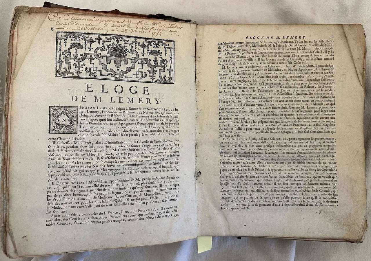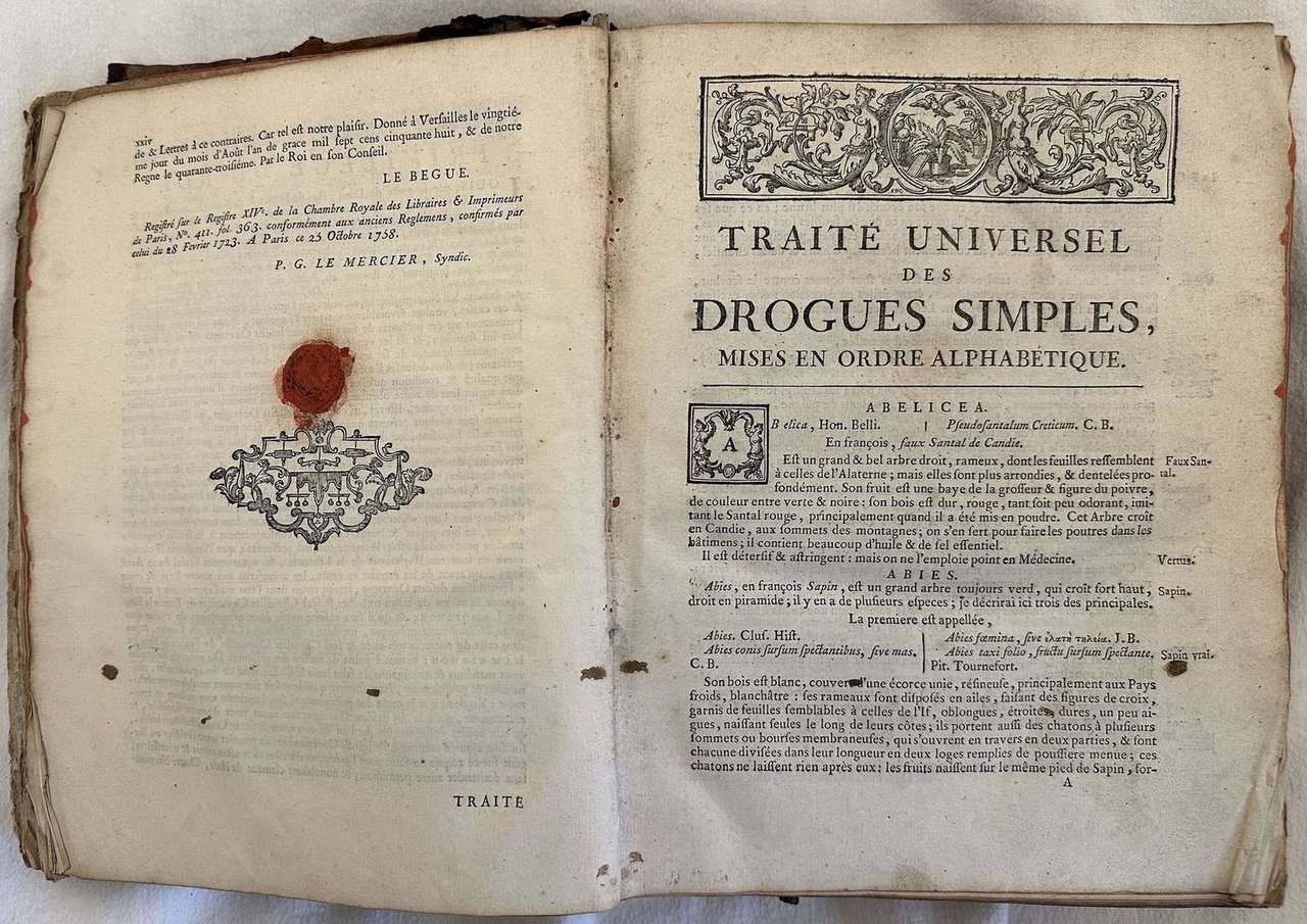 Edizione del 1759 di questa celebre opera di farmacia del chimico e medico francese Nicolas Lemery (1645-1715). Laureatosi in chimica lavorò come apprendista prima nella farmacia dello zio poi in quella di Cristopher Glaser farmacista alla corte di Luigi XIV e di Bernardin Martin che gli permise di introdursi nei circoli intellettuali di Parigi. Aprì in seguito una sua farmacia. Seguace delle teorie di cartesio e Pierre Gassendi, abbandonò quelle di Paracelso e Jean Baptiste Van Helmont. Abile oratore catturava l'attenzione di ogni tipo di persone favorendo così la diffusione delle sue teorie. L'opera, pubblicata per la prima volta nel 1698 come seguito della sua "Pharmacopee universelle" descrive centinaia di specie vegetali e il loro utilizzo in ambito farmaceutico. Ritratto dell'autore in antiporta e alla fine del volume 25 tavole fuori testo che mostrano numerose specie vegetali e animali. Timbro di ceralacca alla fine della prefazione. Antiche note manoscritte datate 1793 e 1948. In discrete condizioni. Copertina in piena pelle coeva con titolo e decorazioni in oro al dorso in mediocri condizioni generali con usure e mancanze ai margini e dorso. Legatura in buone condizioni. Pagine in buone condizioni con fioriture. Parte mancante al ritratto dell'autore. In 4. cm 27x19,5. Pp. (6)+XXIV+944+(4)+945-1015+XXV tav.+(1) Peso Kg. 2. Edition of 1759 of this famous work of pharmaceuticals by the french chemistry and physician Nicolas Lemery (1645-1715). He got a degree in chemistry and worked as a pupil before in the pahrmacy of his auntthan in that of Cristopher Glaser pharmaceutical in the court of Luigi XIV and Bernardin Martin who permitted him to introduce int he intellectual circles of Paris. He opened his activity. He was follower of the theories of Cartesio and Pierre Gassendi, leaving them of Paracelso and Jean Baptiste Van Helmont. He was a skilful orator and managed to capture the attention of different kind of people favoring the diffusion of his theories. The work, published for the first time in 1698 a a following of his "Pharmacopee universelle" describes hundreds of vegetal species and their usage of pharmaceutical field. Portrait of the author in the frontspice and at the end of the volume 25 showing different vegetal and animal species. Wax stamp in the end of prefation. Antique handwritten notes dated 1793 and 1948. In fair conditions. Full leather coeval cover with gilted title and decorations in the spine in poor general conditions with wearings and lackingsn in the extremities. Binding in good conditions. Pages in good conditions with foxing. Missing part in the portrait of the author. In 4. cm 27x19,5. Pp. (6)+XXIV+944+(4)+945-1015+XXV tav.+(1) Weight Kg. 2.