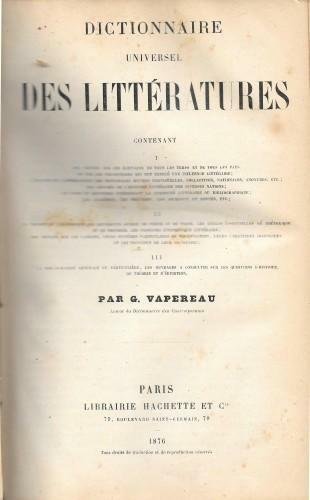 in 8° grande (Kg. 3,100), pp. XVI, 2096, leg. coeva m/pelle con angoli, tit. e filetti in oro, piatti e sguardie marmor. Eccellente opera di consultazione che offre notizie sugli scrittori di tutti i paesi e di tutte le epoche, l'analisi e la valutazione di opere individuali, collettive, anonime etc.; riassunti di storia delle letterature, fatti interessanti, teatri, accademie, giornali. Teoria e storia dei differenti generi di poesia e prosa, regole essenziali di retorica ed estetica letteraria; nozioni sulle lingue e i loro sistemi di versificazione, caratteri distintivi e regole di grammatica. Bibliografia generale e particolare. Lievi fior. e piccole sbucc. alla leg. 531/38