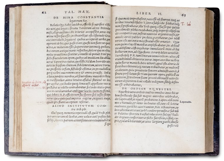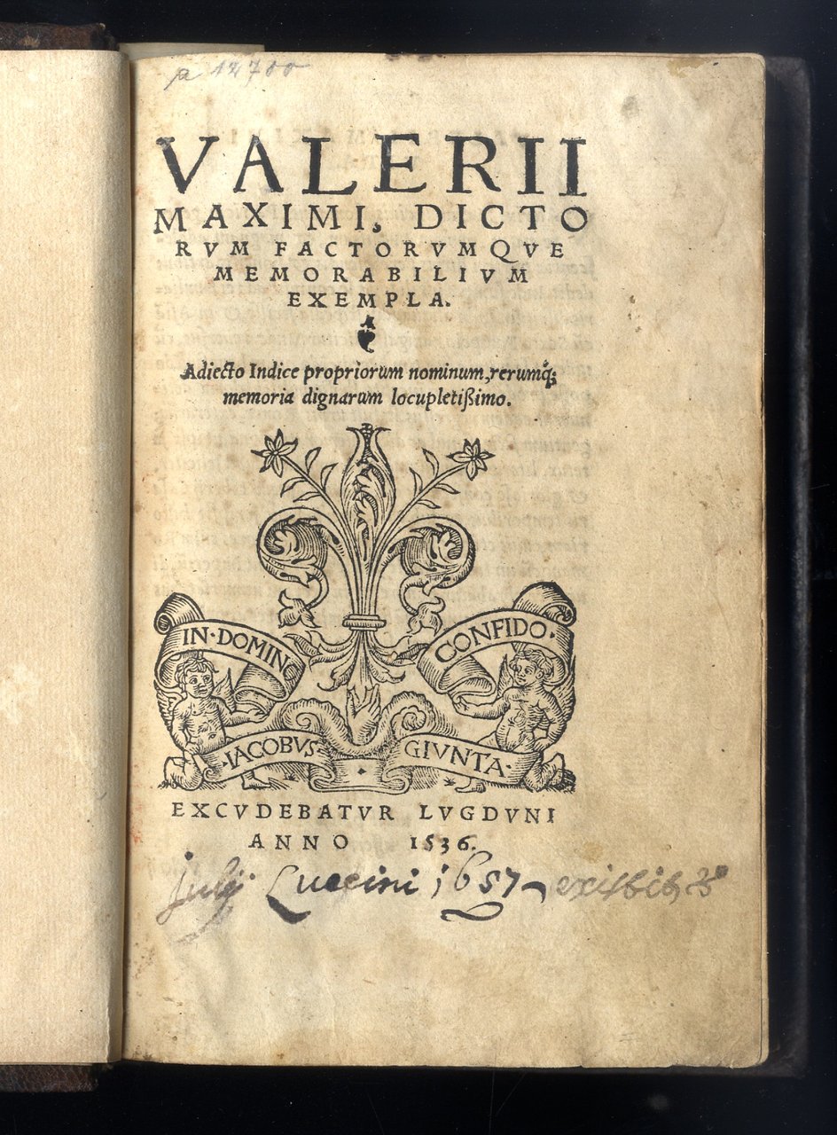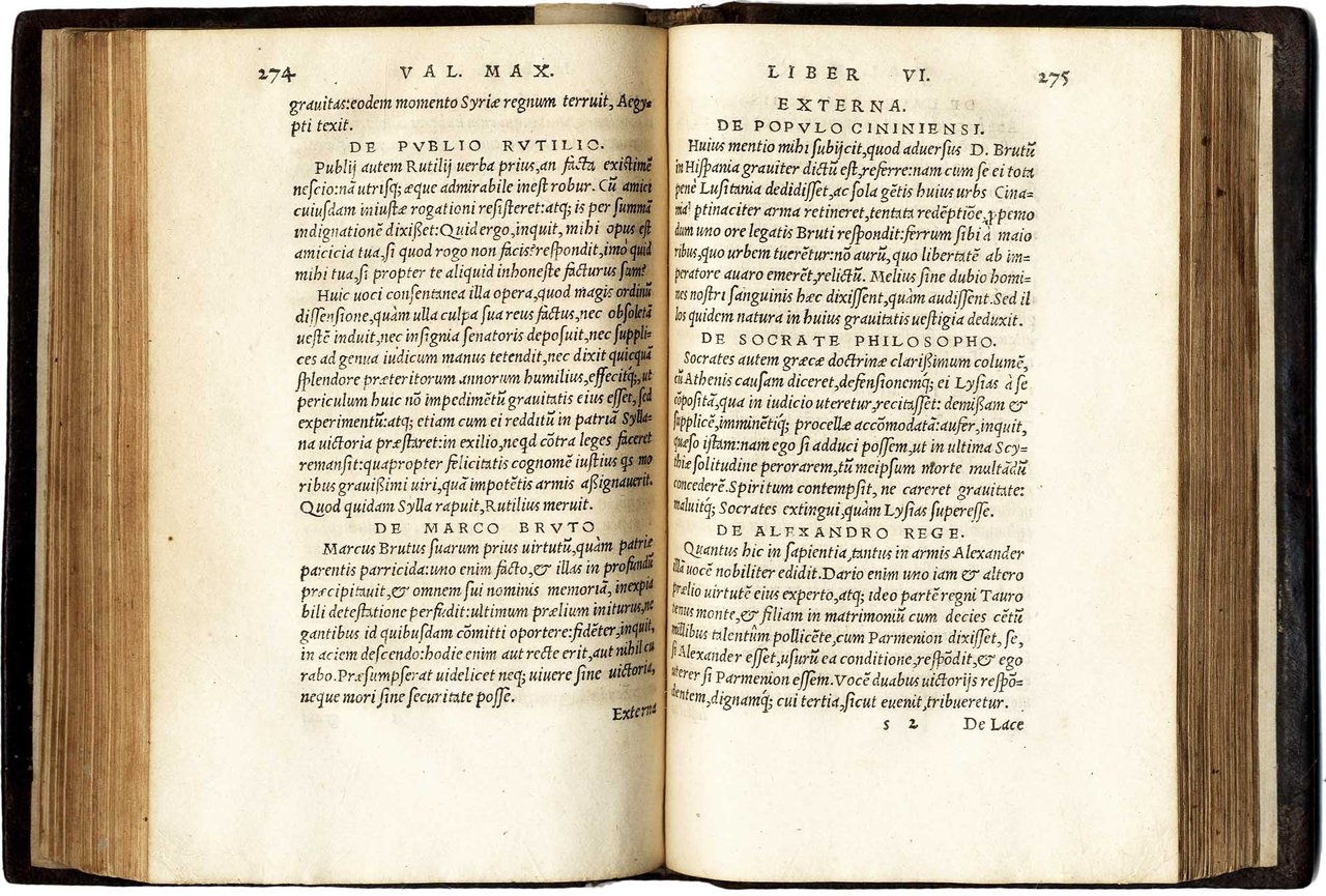 >in-8,  (164x106 mm), pp. 443, (20) di indici, splendida legatura coeva in p. marocchino bruno, con ricchi fregi a secco su dorso a nervetti (abili antichi restauri alle cuffie e agli spigoli), piatti decorati in oro e a secco con doppio ordine di bordure ornate da semicerchi al centro e dentelle in oro agli angoli, tagli dorati. Elegante edizione in corsivo assai rara, mancante a Baudrier. Grande classico di erudizione divulgativa, l'opera riunisce aneddoti ripresi da Erodoto, Senofonte, Cicerone, Livio, Varrone in particolare e 95 categorie di vizi e virtù. Gli exempla furono utilizzati dai retori, per per dare peso alle loro argomentazioni nei loro discorsi. Esemplare marginoso, con nota di possesso secentesca al titolo, qualche fioritura e alone d'umido agli ultimi fogli; alcune pertinenti chiose manoscritte dell'epoca.