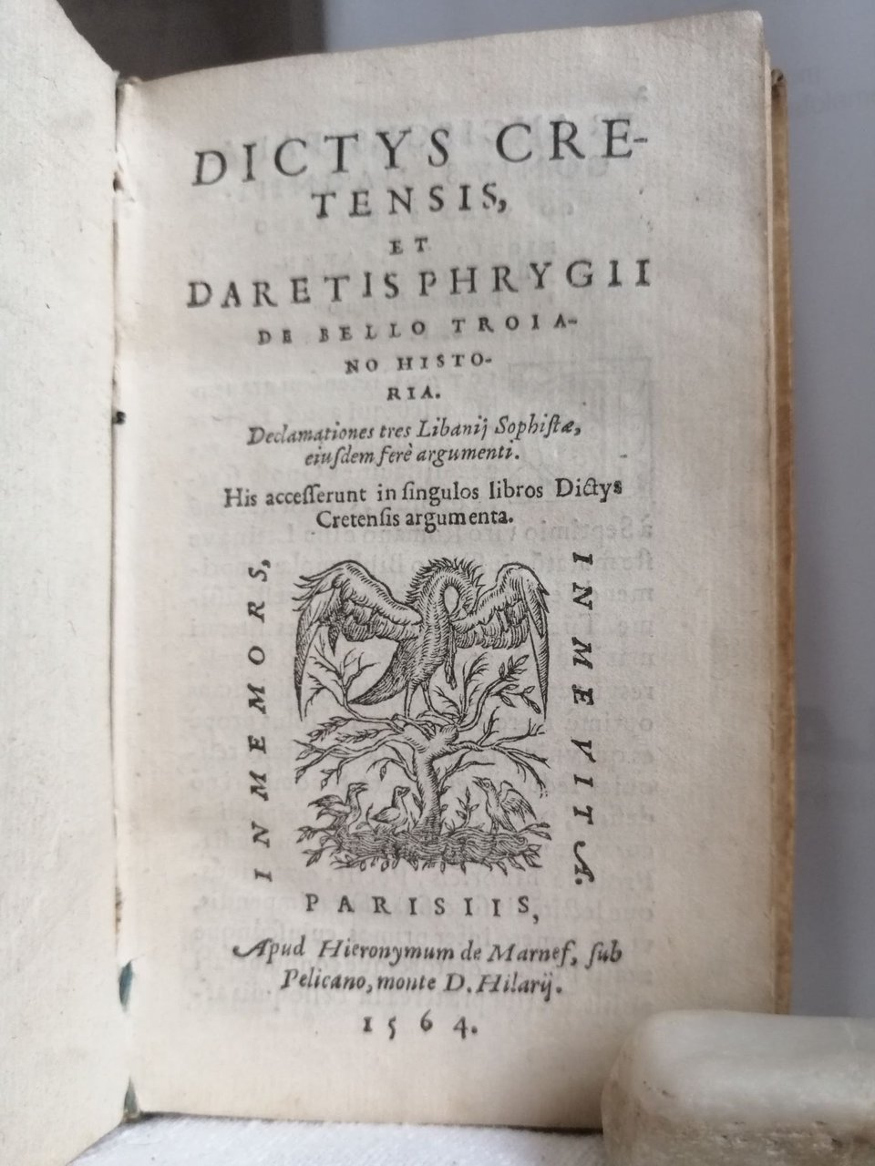 Dictys Cretensis, et Daretis Phrigii DE BELLO TROIANO HISTORIA Declamationes tres Libanii Sophistae, eiusden sere argumenti. His accesserunt in singulos libros Dictys Cretensis argumenta
