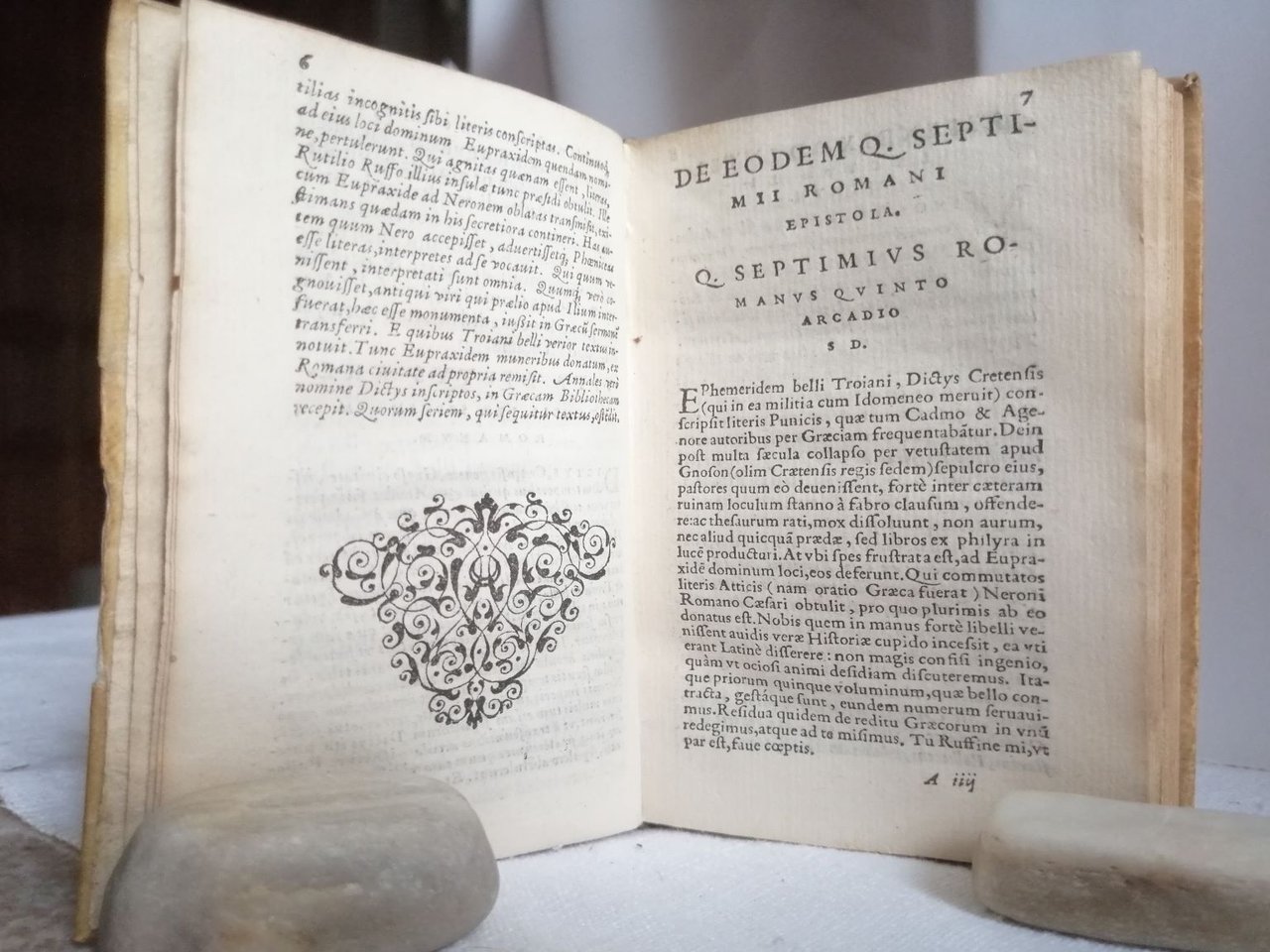 Volume in 16 ma con registro in 8 legato in pergamena, scritta a pennino al dorso, sguardie, frontespizio con bella marca silografica, 208 pp. Un'avvincente narrazione dell'epopea troiana meno carica di Dei e Semidei, pi attenta ai fatti d'arme. Di grande fascino. Delizioso volumetto in perfetto stato. Raro