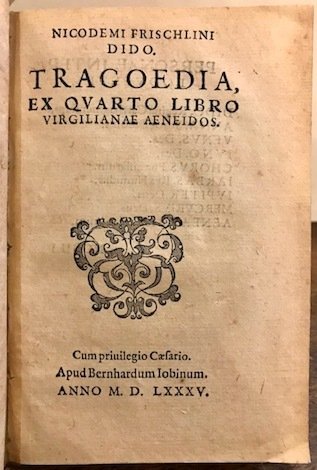 8vo (cm. 15), 20 cc.nn. Capolettera e fregi xilografici n.t. Legatura ‘700 in cartoncino decorato. Tagli marmorizzati. Lievi ingialliture ed un minuscolo foro di tarlo restaurato al margine esterno bianco delle ultime carte ma, nel complesso, ottimo esemplare. Raro estratto dalla prima edizione di ‘Operum poeticorum pars scenica’ (cfr. Adams F-1042) dell’umanista e drammaturgo tedesco Frischlin.