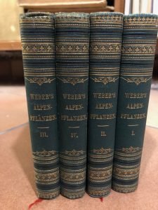 .IN 400 NACH DER NATUR COLORIRTEN ABBILDUNGEN IN NATURLICHER GROSSE ". Quattro splendidi volumetti corredati di 400 tavole a colori di fiori delle Alpi Svizzere e Tedesche .Didascalie in latino, inglese, tedesco e francese. Firma di appartenenza di vecchio proprietario alla sguardia dei 4 volumi, per il resto ottimi. Ciascun volume consta di circa 30 pagg. di testo e circa 100 tavole di ill. a col. Mis mm 140x95.Tutta tela edit. con fregi e tit. oro al piatto e al dorso.