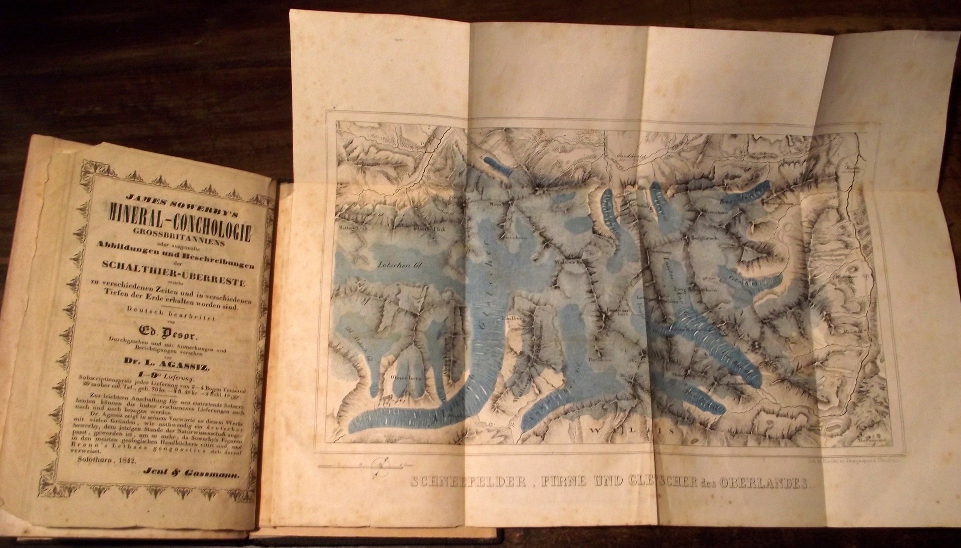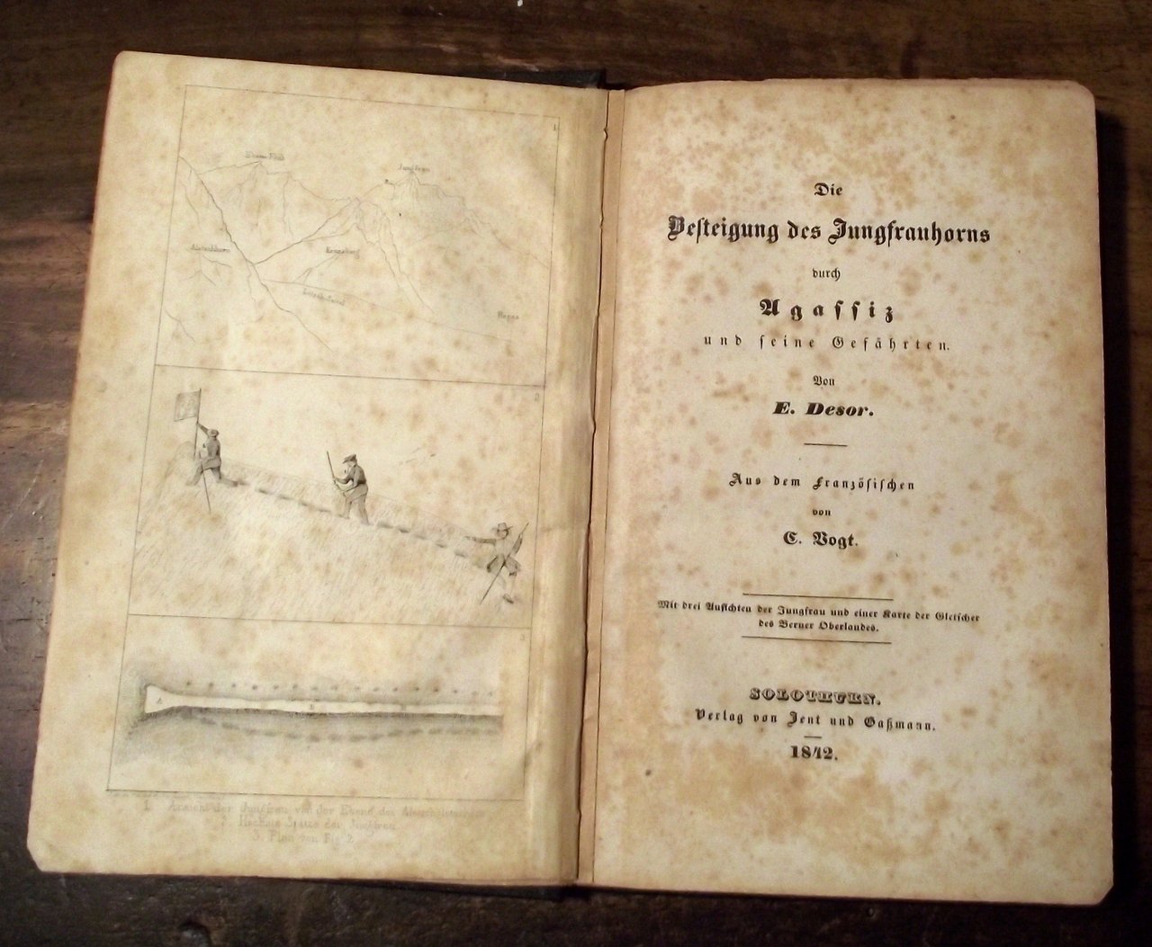 >in-8, pp. 96, (2), una tavola ripiegata a colori azzurri, che mostra la locazione di ghiacciai, nevai e zone nell'Oberland Bernese. n antiporta graziosa tavola tripartita. Leg. in percallina nera. Rara prima traduzione tedesca della celebra opera: ''L'ascension de la Jungfrau, effectuée le 28 août 1841 par MM Agassiz, Forbes, du Chatelier et Desor, précédée du récit de leur traversée de la Mer de Glace, du Grimsel à Viesch en Valais'' pubblicata nel 1841 a Ginevra. La traversata del mare di ghiaccio di Viesch era considerata tra le più difficili dell'Oberland ed era stata compiuta, in precedenza, solo 3 volte, nel 1812, 1832 e 1840. Agassiz e i suoi compagni si avventurarono, nella medesima escursione, nella traversata del Colle dell'Oberaar e poi nell'ascesa dello Jungfrau. Esempl. con ex-libris Hermbossard. Wäber BSL III/137; Lehner pp. 328-335; Perret N ^ 21, solo l'edizione francese del 1841