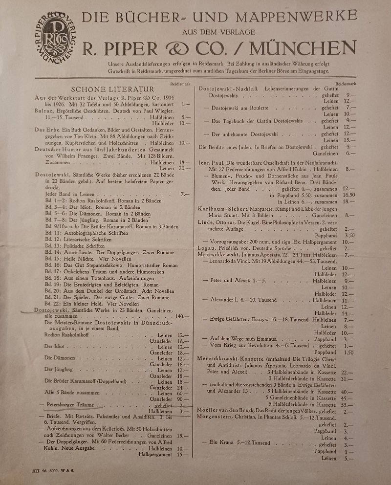 Drei mehrseitige Broschüren des Piper-Verlags in München (bis heute bestehend). Das Verzeichnis der Bücher- und Mappenwerke stammt von 1926 (papierbedingt gegilbt) und listet sehr viele Buchpublikationen und Kunstdrucke auf 6 großformatigen Seiten mit Variationen und Preisen. Die zwei Broschüren der Piper-Drucke (Kunstdruckpapier mit vielen Abbildungen) stammen von ca. 1930, die Preise sind hier bereits andere als im Verzeichnis von 1926. Drei gut erhaltene Werbebroschüren eines Verlags in der Weimarer Republik!