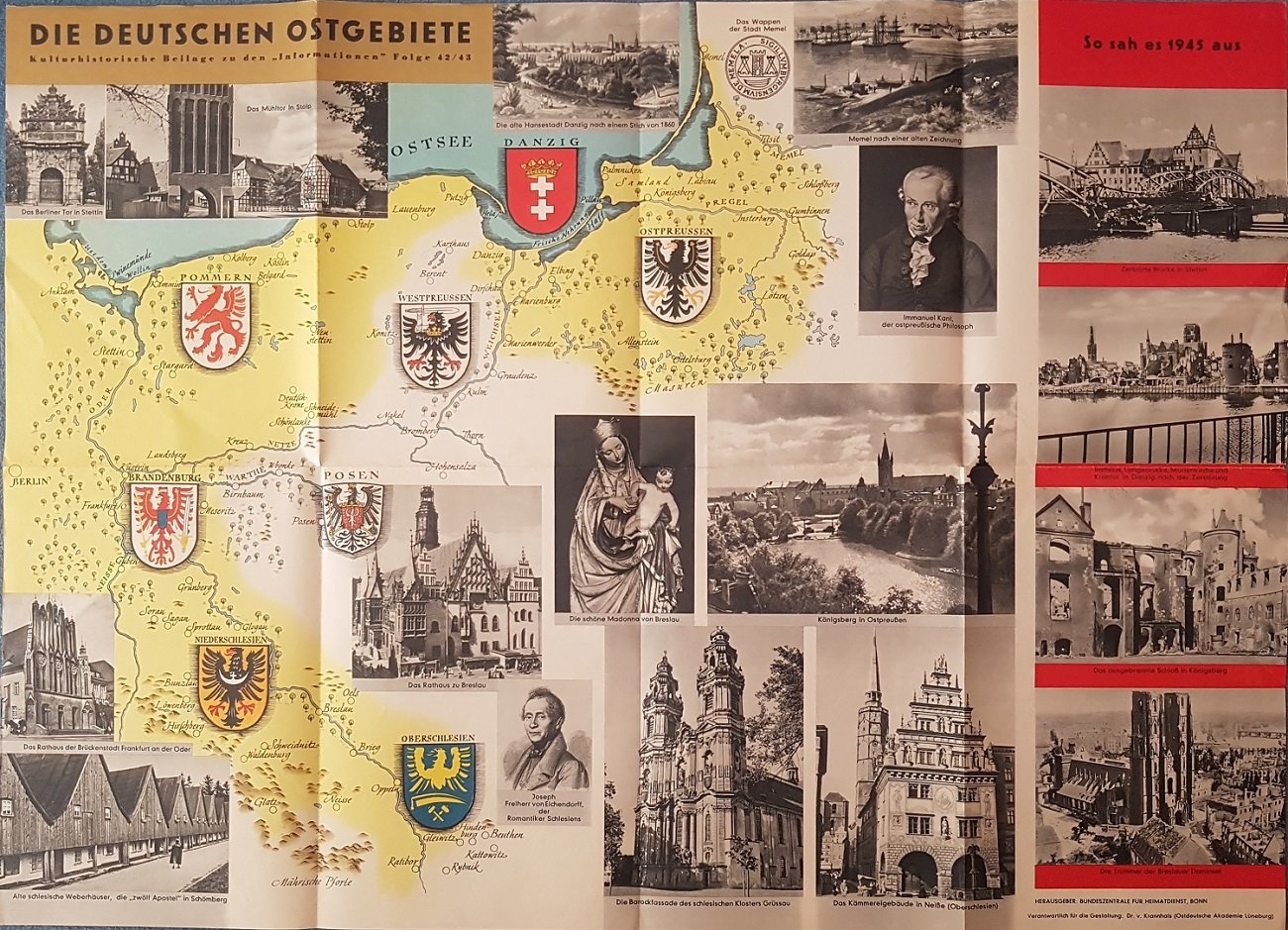 Plakat der Bundeszentrale für Heimatdienst (erst ab 1963: Bundeszentrale für politische Bildung) aus den 1950er Jahren. Das großformatige Plakat zeigt links eine Karte mit Wappen der Ostgebiete (Westpreussen, Ostpreussen, Posen, Pommern, Brandenburg, Niederschlesien, Oberschlesien) auf ca. 1/3 der Gesamtfläche. Auf den anderen 2/3 sind zahlreiche fotografische Abbildungen von Gebäuden aus den bedeutendsten Städten wiedergegeben, teils auch mit kontrastierenden Aufnahmen aus dem Jahr 1945. Sehr seltenes Großplakat aus der Frühphase der Bundesrepublik und ihrer Institutionen in den 50er Jahren!