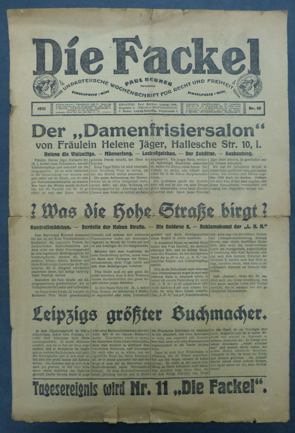 Überaus interessante Zeitung aus Leipzig, welche scheinbar den Namen des Wiener Originals von Karl Kraus zu eigenem Vorteil ausnutzte. Die Zeitungsseiten beinhalten vor allem Hinweise auf vermutlich illegal betriebene Bordelle und Buchmacherbetriebe sowie kurze Beschreibungen von miserablen Arbeitsbedingungen einiger Firmen. Laut einer kurzen Meldung in der Wiener "Fackel" wurde der Herausgeber und vermutlich auch Autor Paul Berner später wegen Erpressung verhaftet. Die letzte Seite der Zeitung enthält auch Anzeigen von einigen Leipziger Firmen. Insbesondere jedoch sind dort die Anzeigen des Herausgebers selbst zu lesen, der sich auch als Detektiv und Geldeintreiber anbot. Die Zeitung erschien nur in den Jahren 1920/21, dann wurde das Erscheinen eingestellt. Sehr seltene Archivalie aus Leipzig in den Jahren nach dem Ersten Weltkrieg.