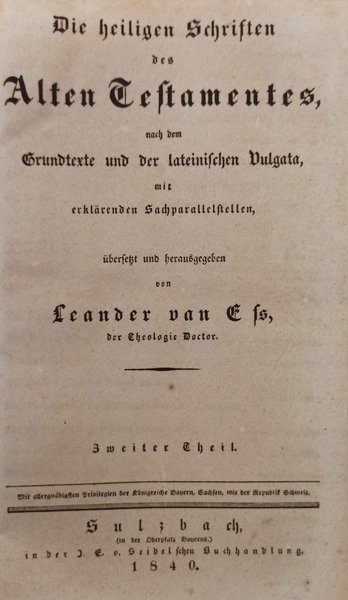 Copertina Rigida in similpelle nera<BR>Condizioni Molto buone<BR>Lingua Tedesco<BR>Prima edizione. 802 pagine. LE SACRE SCRITTURE DELL'ANTICO TESTAMENTO, con deviazioni interrate dalla Vulgata latina, e passaggi paralleli esplicativi. Rilegatura visibile tra alcune pagine. Copertina interna e poche pagine ingiallite dal tempo.