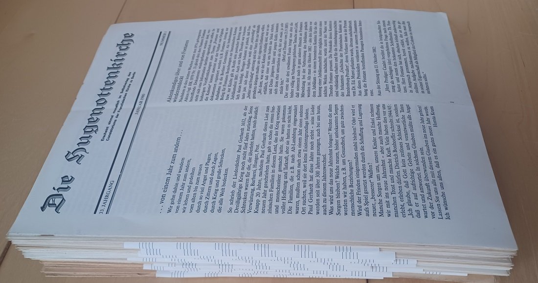 Erschien monatlich (ab 1971 mit Doppelnummer Juli/August). - 20.Jahrgang 1967 (fehlt 1,2,3,8) - 1968 (fehlt 7) - 1969 complett - 1970 (fehlt 1,3,7,8) - 1971 (fehlt 3,4,5) - 1972 complett - 1973 (fehlt 6) - 1974 (fehlt 5) - 1975 complett - 1976 complett - 1977 complett - 1978 (fehlt 6) - 1979 (fehlt 9) - 1980 (fehlt 2,7/8). - Enthält Ttheologisches, Geschichtliches, Nachrichten aus der Gemeinde Ost und West, Predigtplan Ost und West.