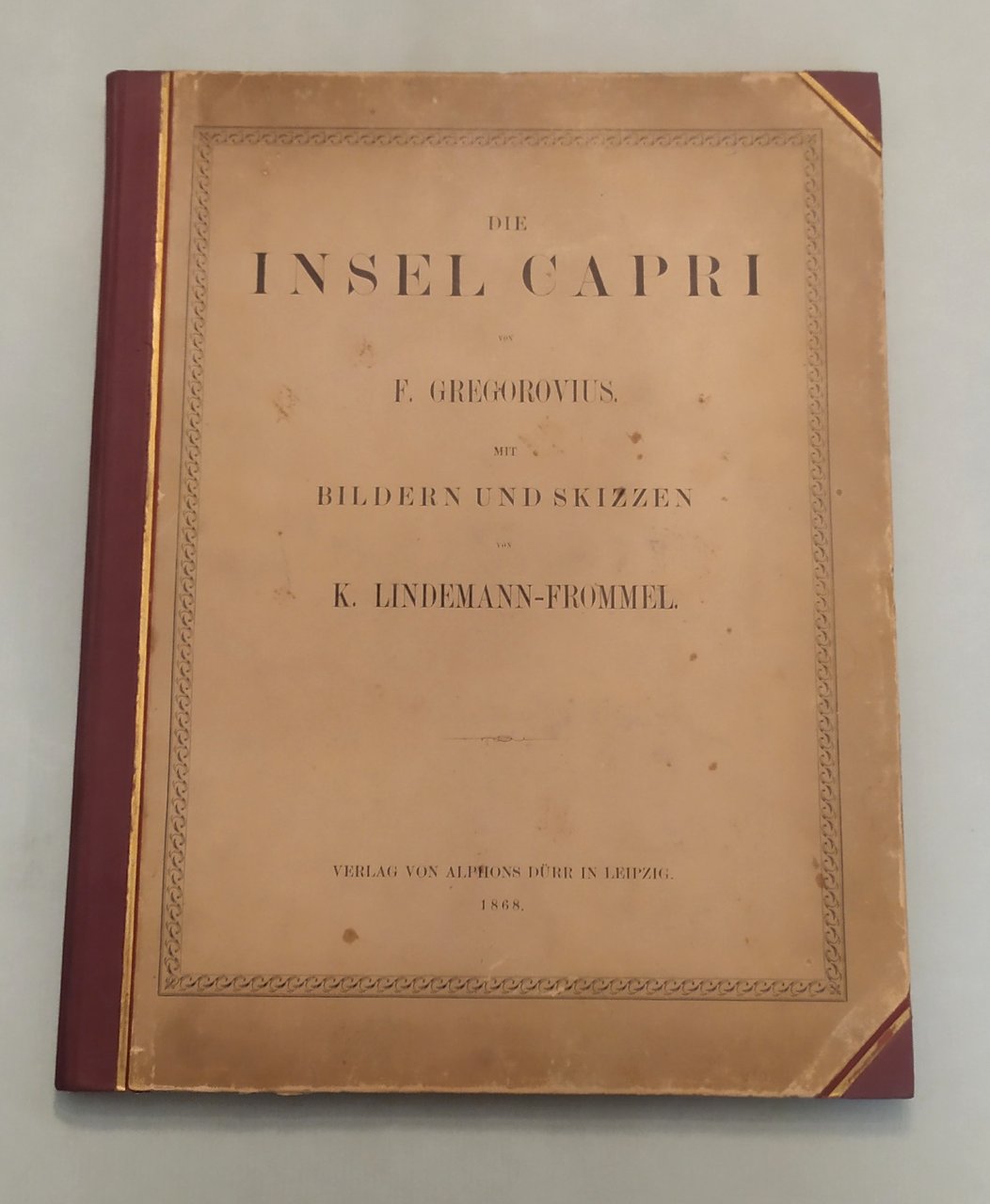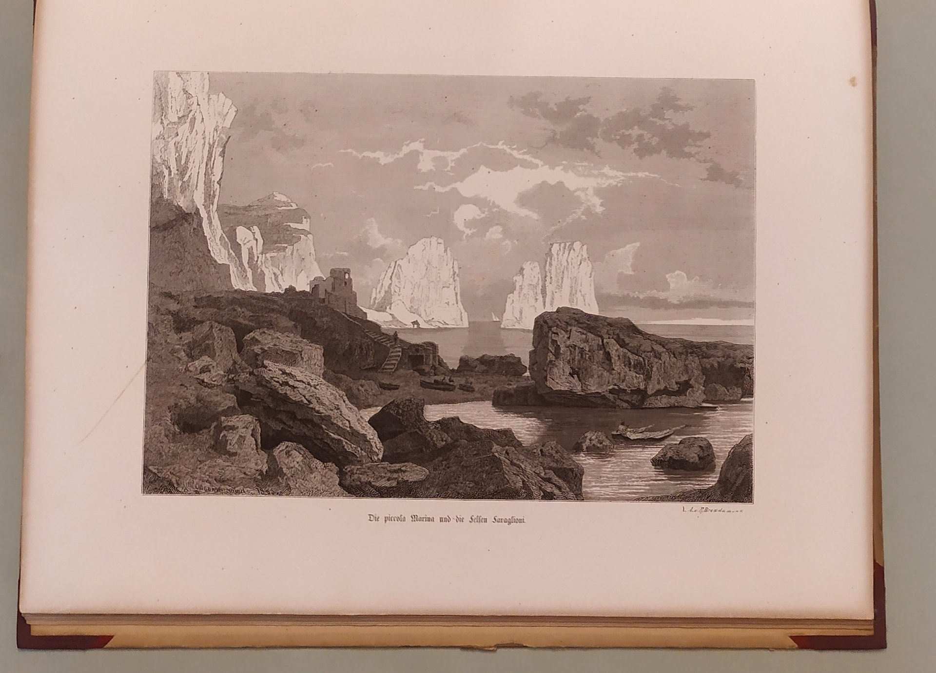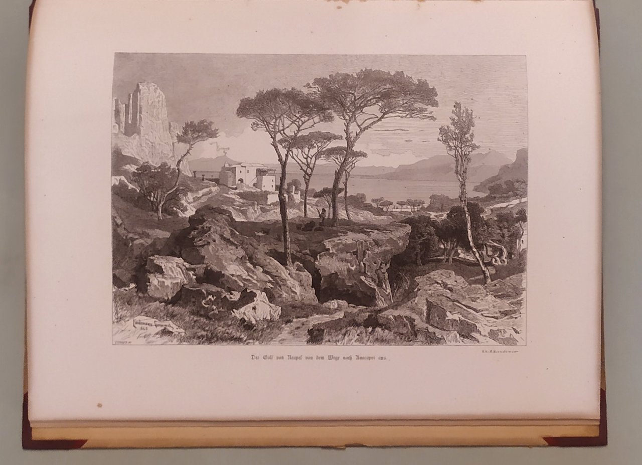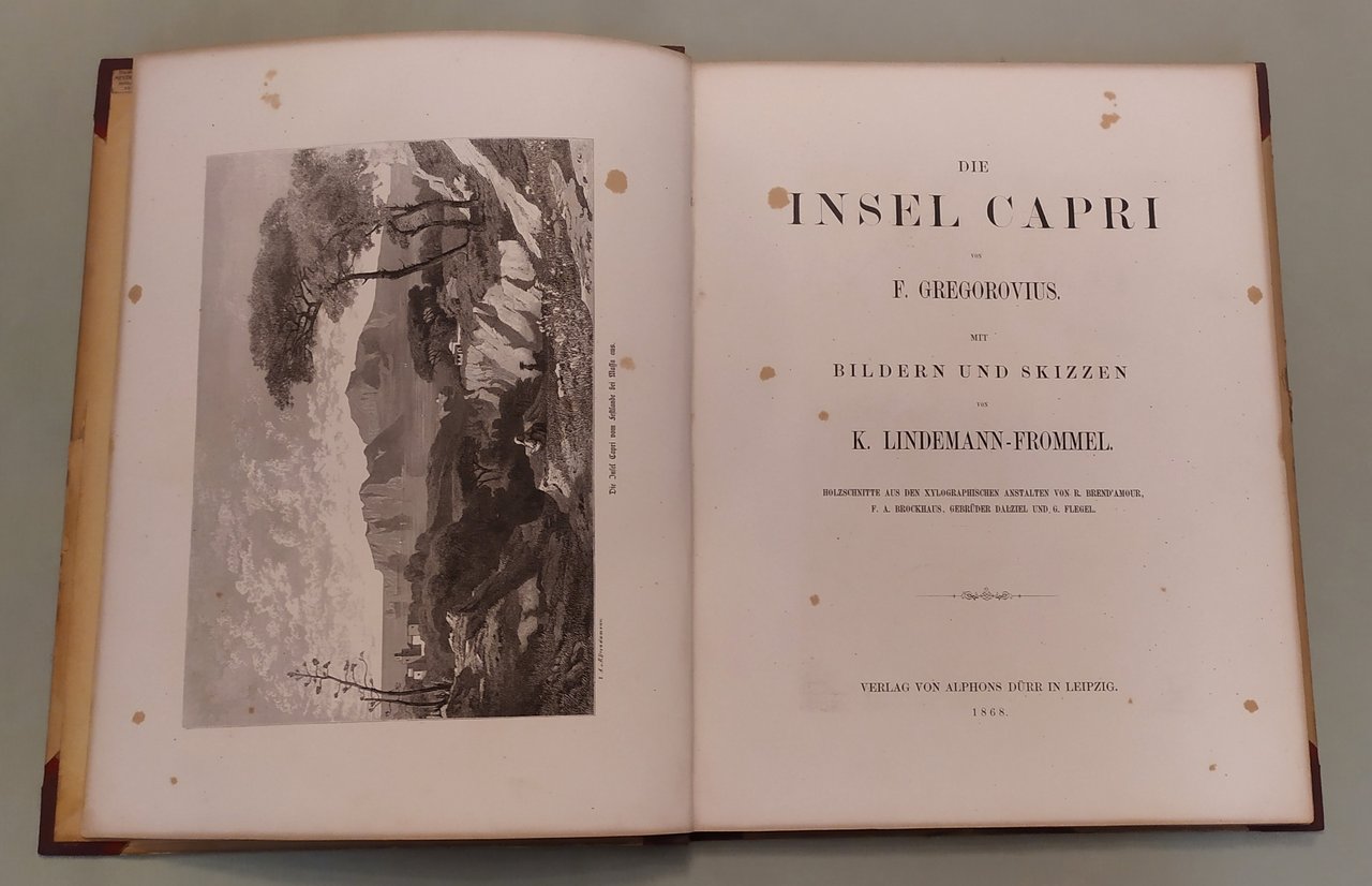 Leipzig, Dürr, 1868. In 4to (cm.38x30); pp. 6n.nn., 53, 3n.nn. Otto tavole fuori testo e dieci illustrazioni nel testo. Fioriture al margine interno di qualche pagina. Testo inquadrato. Mezza tela con angoli, titolo in nero al piatto anteriore, dorso rinnovato. Sontuosa pubblicazione d’importanza storica per il testo e soprattutto per le tavole incise con molta arte e finezza, che riproducono luoghi, personaggi, vedute, case e tutto quanto ha importanza artistica a Capri. Doria, pag. 425; Furcheim, pag. 11.