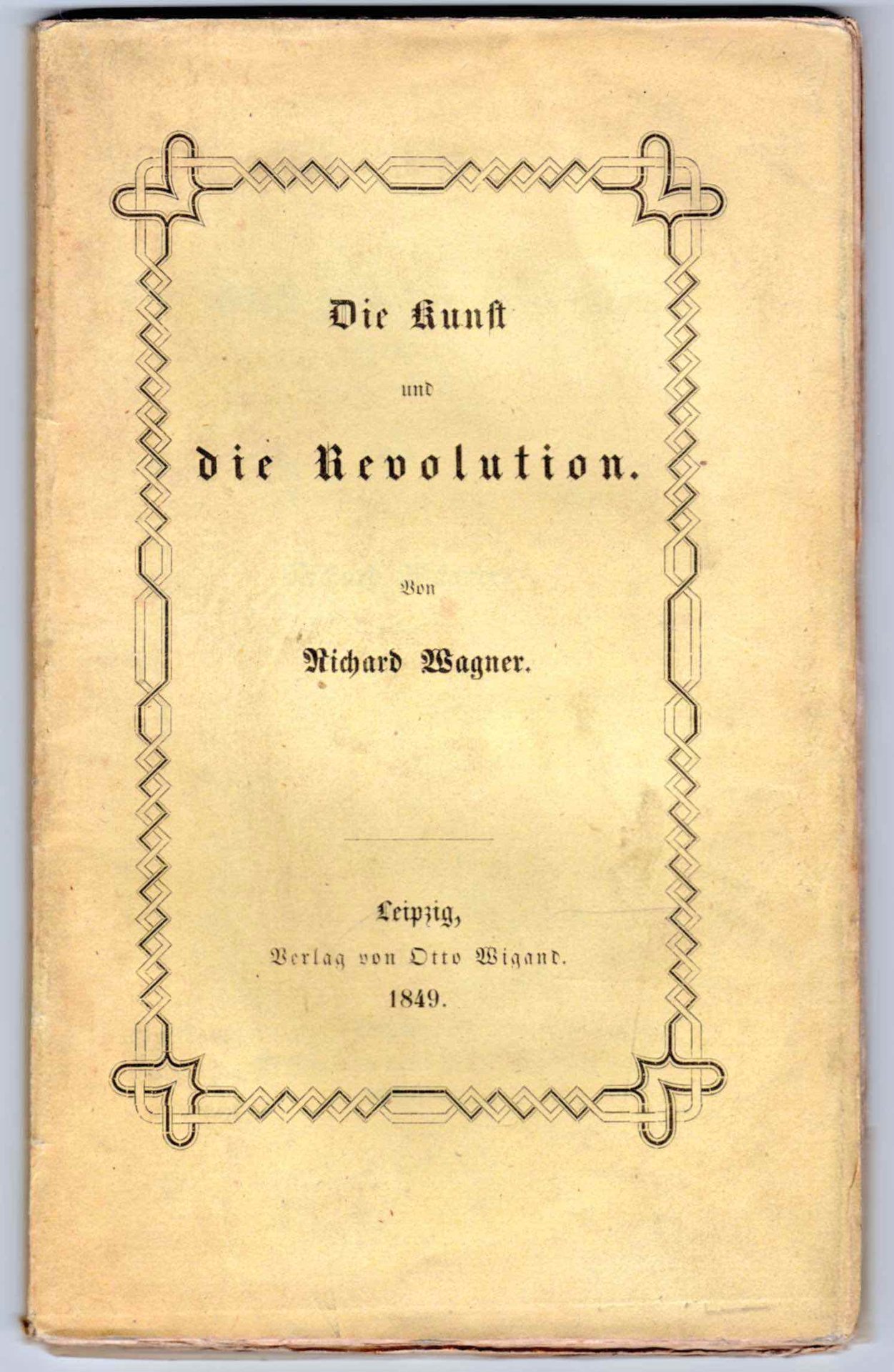 LIBROEdizione originale. Saggio scritto in esilio a Zurigo dopo i fatti rivoluzionari del ’48, rappresenta uno dei cardini essenziali del pensiero del compositore tedesco — che tanto influenzò l’Europa di fine secolo e del primo Novecento. È qui che compare per la prima volta, riferito al dramma greco classico, il termine «Gesamtkunstwerk», opera d’arte totale. Fioriture sparse dovute alla qualità della carta, per il resto ottimo esemplare intonso.