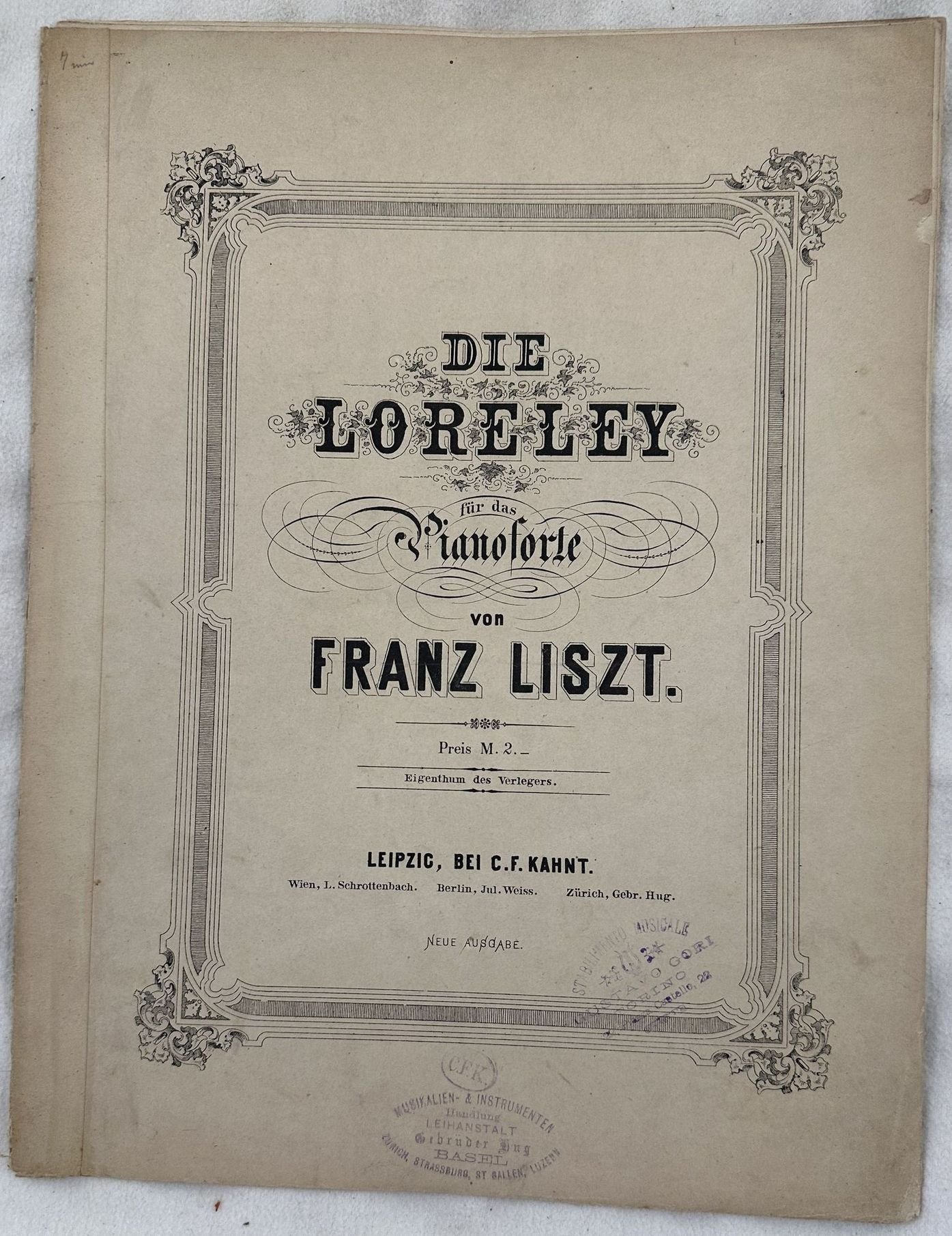 Edizione del 1880 circa della melodia "Die Loreley" di Franz Liszt (1811-1886). Copertina illustrata e pagine in cornice. In buone condizioni. Copertina editoriale in buone condizioni con lievi usure marginali. Dorso ricoperto da carta. Legatura in buone condizioni. Pagine in buone condizioni con rare fioriture. In Folio. cm. 33,5x26. Pp. 11.Edition of 1880 circa of the melody "Die Loreley" by Franz Liszt (1811-1886). Illustrated cover and pahes in a frame. In good conditions. Editorial cover in good conditions lightly worn in the extremities. Spine covered by paper. Binding in good conditions. Pages in good conditions with occasional foxing. In Folio. cm. 33,5x26. Pp. 11.