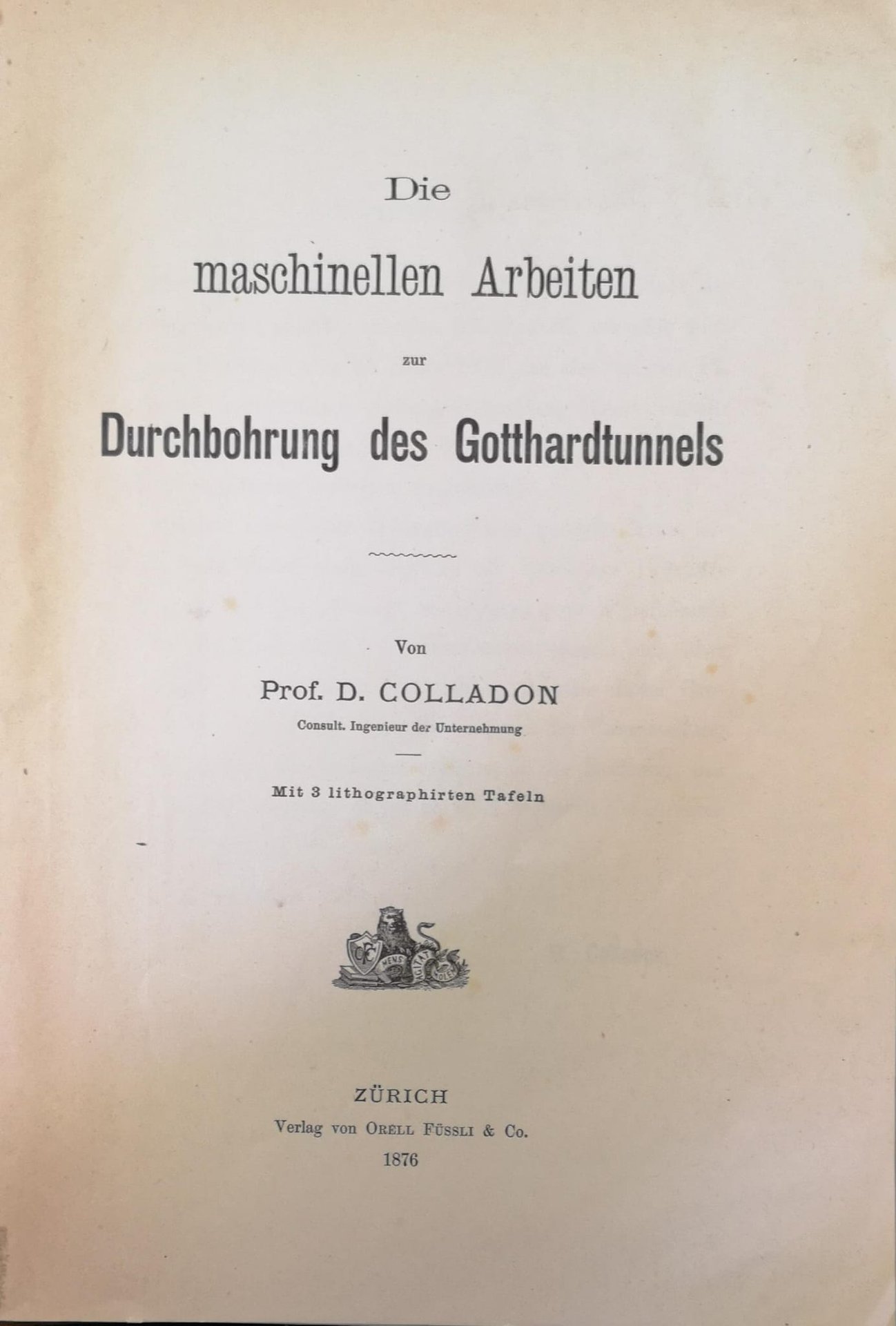 In-8 p. (mm. 226x156), brossura editoriale (lievi ingialliture e fioriture), pp. 33,(3), con 3 tavole litografiche fuori testo, più volte ripiegate: System des Abbaues (con 2 figg.) // Die Motoren und Compressoren-Anlage in Airolo: Langenschnitt // Die Motoren und Compressoren-Anlage in Airolo: Grundriss. Testo ben conservato.