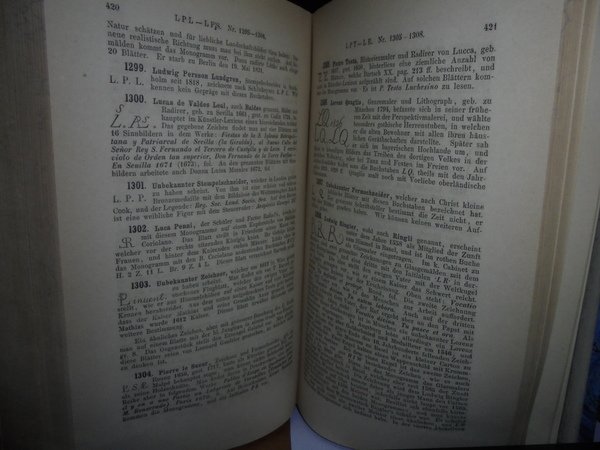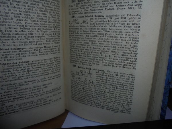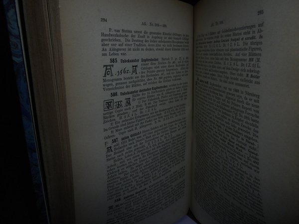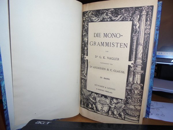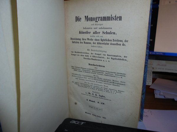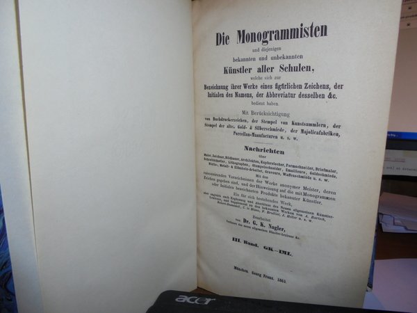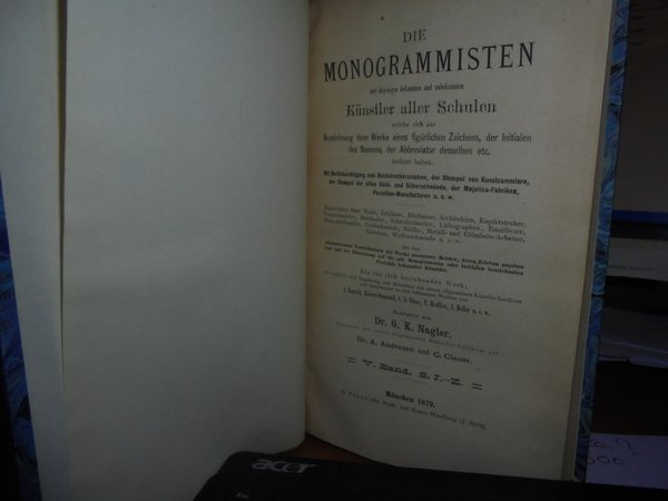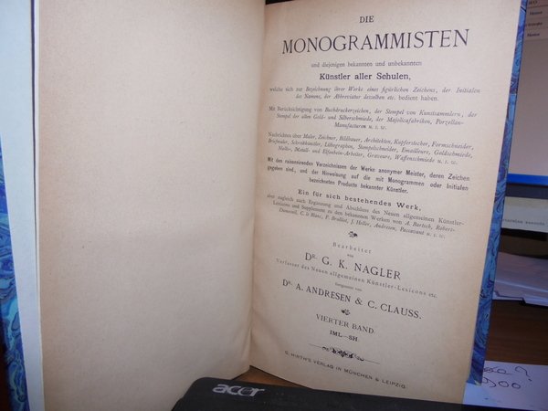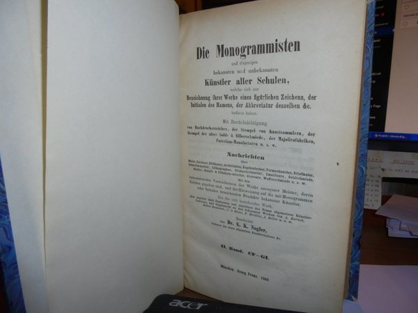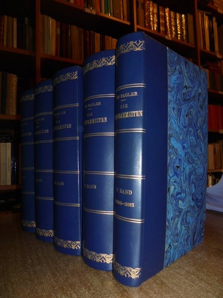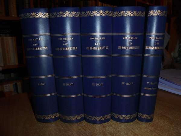 Georg Kaspar Nagle. München, Georg Franz, 1858. München & Leipzig, G. Hirth's Verlag. Die Monogrammisten und diejenigen bekannten und unbekannten Künstler aller Schulen, welche sich zur Bezeichnung ihrer Werke eines figürlichen Zeichens, der Initialen des Namens, der Abbreviatur desselben, &c., bedient haben. 5 volumi in-8°, m. pelle con fregi e titoli in oro ai dorsi. I. xviii, 1088 pp.; II. viii, 1121 pp.; III. iv, 1143 pp.; IV.1155 pp.; V. (3), 436 pp.; 109, (3) pp. Ottimo esemplare in prima edizione (completo). Uff. E - V - 4