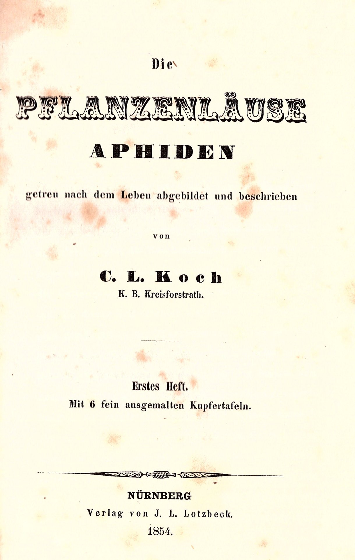 In-8° (218x134mm), pp. VIII, 336, legatura coeva m. pelle rossa con piatti marmorizzati. 54 tavole a colori incise su rame f.t., raffiguranti complessivamente 396 tipi di afidi. Ottimo stato. Prima edizione, rara completa di tutte le tavole, di una delle primissime monografie organicamente dedicate agli afidi. L'opera apparve in complessive 9 dispense; sono conservati i frontespizi della prima, con la data del 1854, e dell'ultima, datata 1857. Il Koch (Kusel, 1778-Norimberga, 1857) fu uno dei massim entomologi ed aracnologi tedeschi del proprio tempo.La sua opera principale, Die Arachniden (1831-1848), in 16 volumi, è una grandiosa classificazione delle varietà di ragni di tutto il mondo (egli ne curà gli ultimi 12 volumi, in quanto i primi 4 erano stati compilati da Carl Wilhelm Hahn). Horn-Schenkling, 12046. Nissen, ZBI, 2248. Cfr. Rudolf Roesler, Karl Ludwig Koch (1778-1857). in Oberpfälzer Heimat, Auflage 42, Weiden 1997 / '98.