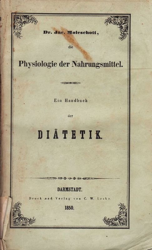 Die Physiologie der Nahrungsmittel. Ein Handbuch der Diätetik. Friedrich Tiedemann's Lehre 'von dem Naturbedürfniss, dem Nahrungstrieb und den Nahrungsmitteln des Menschen', nach dem heutigen Standpuncte der physiologischen Chemie völlig umgearbeitet von Jac. Moleschott.