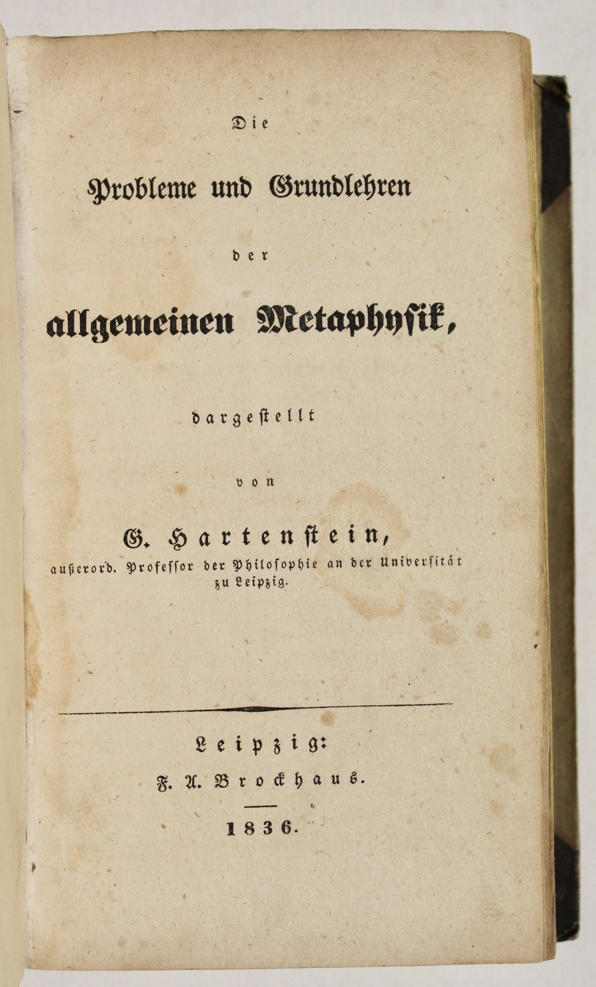 In 8° (mm 210x135) pagg. XXXII, 537(1). Mezza pelle coeva con angoli, titolo impresso in oro al dorso e fregi Dorati. Prima edizione. Gustav Hartenstein (18 marzo 1808 - 2 febbraio 1890) fu un filosofo e scrittore Tedesco fra I più dotati seguaci di Johann Friedrich Herbart; nacque a Plauen, in Sassonia, e fu educato alla Fürstenschule di Grimma. Dal 1826 studiò all'Università di Lipsia, dove ebbe come insegnanti Karl Gottfried Wilhelm Theile, Heinrich Gottlieb Tzschirner, Christian Wilhelm Niedner. Nel 1833 ottenne l'abilitazione per la filosofia con la tesi De Archytae Tarentini fragmentis philosophicis e nel 1836 fu nominato professore ordinario all'Università di Lipsia. Nel 1848/49 divenne rettore accademico. Buon esemplare con arta leggermente brunita; tracce d'uso alla legatura a cerniere e spigoli.<BR>Ziegenfuss I, pag. 448: "Il filosofo Gustav Hartenstein (1808-1890) pubblicò le opere di Kant in 10 volumi. (1838) e in 8 volumi (1867), nonché le opere complete di Herbart in 12 volumi. (1850 )".<BR> <BR>