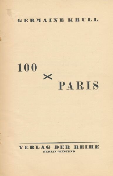 Berlin Westend Verlag der 1929 Berlin Westend Verlag der Reihe 1929. Grand In-8 carré, pleine toile grège. XXXI pages pour la préface de Florent Fels (dans les 3 langues : Allemand, Français, Anglais) et 100 superbes photos de Paris en noir et blanc par Germaine Krull. La jaquette est manquante, les feuillets se détachent.