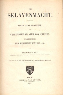 VI, 158 S., 1 Bl. Mit 7 Karten in Holzstich. 8°, HLeinen der Zeit mit goldgepr. RFileten, marm. Schnitt. Sabin 23948. -. Erstausgabe. - Fay (1807 - 1898), von 1828 bis 1833 Herausgeber des »New York Mirror«, war nach 1837 auf verschiedenen diplomatischen Posten in England, Deutschland und in der Schweiz tätig. Ab 1861 lebte er in Berlin im Ruhestand. Ein Teil seiner Werke erschien seitdem auf Deutsch. Die vorliegende Schrift, deren "Ertrag . für die befreiten Sklaven in Amerika bestimmt" ist, unternimmt die Verteidigung Abraham Lincolns. - Exlibris des Juristen Ernst Riemschneider, papierbedingt leicht gebräunt, Einband etwas berieben und bestossen. - The indicated shipping costs refer to books weighing up to one kilogram. - Bücher, die schwerer als ein Kilogramm oder größer als 35 x 25 cm sind, werden als Paket verschickt und kosten innerhalb Deutschlands bis zu zwei Kilogramm 6 Euro, darüber hinaus 7 Euro Porto. -