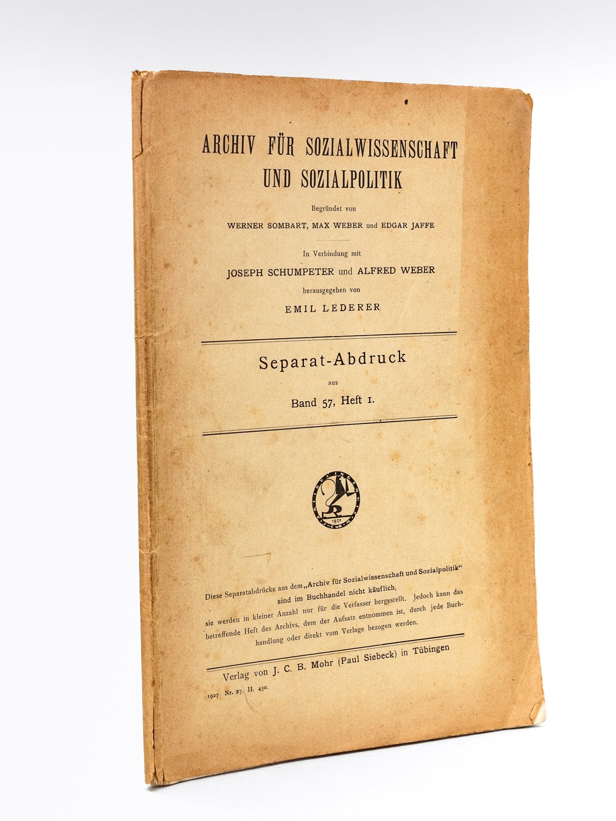 Archiv für Sozialwissenschaft und Sozialpolitik. Separat-Abdruck aus Band 57, Heft 1, 1 brochure in-8, Verlag von J. C. B. Mohr (Paul Siebeck), Tübingen, 1927, 67 pp. Edition originale. Très rare exemplaire du tiré-à-part. Etat très satisfaisant (couverture frottée avec petits manques, nombreuses annotations de Georges-Henri Bousquet qui conclut "Regrettable qu'il ne cite pas Pareto, comme ci-dessus Mosca).