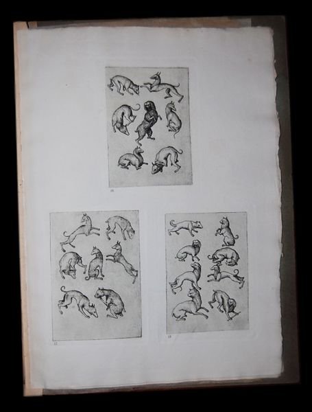 In folio (39x28 cm); 20, (2), (2 b.) pp. e 13 c. di tav. Legatura editoriale in mezza tela con titolo ed immagine al piatto anteriore (una leggerissima brunitura al margine superiore). Un ritaglio allangolo superiore della prima carta bianca in corrispondenza di una dedica Dono dellAutore a togliere il nome del personaggio al quale Lehrs dedicò lopera. Il taglio è stato fatto anticamente e lo si può, facilmente, constatare dal fatto che si è formata una lieve brunitura al frontespizio, di forma quadrata, in corrispondenza dellasportazione della carta. Esemplare per il resto in ottime condizioni di conservazione. Prima edizione (una seconda edizione uscì nel 1892), assai rara, di 250 esemplari numerati. Il nostro esemplare è uno degli esemplari di presentazione tirato fuori dalla numerazione come ben attesta la scritta a stampa in rosso che si trova al posto del numero dellesemplare Widmungs-Exemplar.. Le 13 tavole che contengono le 45 carte, sono finemente incise con una bella e precisa battitura e ogni tavola è protetta da velina. Max Lehrs (24 giugno 1855 Berlino - 12 Novembre 1938, Dresda) è stato uno dei critici darte tedeschi più apprezzato della fine del XIX° secolo. Dopo esser stato nel commercio dei libri e delle opere darte prima e direttore del Museo della Slesia di Breslavia, poi, fu a lungo direttore della Dresden Kupferstichskabinett (dal 1896 al 1904 un a prima volta e poi dal 1908 al 1924). Fu uno dei primi a capire limportanza delle riproduzioni fotografiche per la storia dellarte ma anche come forma di espressione artistica, tanto da instituire un dipartimento di fotografia artistica. Fu anche un appassionato di danza alla visone della quale venne introdotto da Hugo Erfurth. E noto, in modo particolare, per la sua grande conoscenza degli incisori tedeschi ed olandesi del 400 ai quali dedicò alcune importanti opere tanto che ancora oggi, i suoi lavori sono fra le più citate fonti bibliografiche su questi autori. Nonostante la cecità che lo colpì ad un certo punto della sua vita, poté portare avanti la compilazione di altri studi grazie alla sua memoria prodigiosa e allaiuto della figlia. Lopera qui presentata è uno dei più celebri studi critici delle celebri carte da gioco del celebre orafo ed incisore del tardo gotico tedesco, conosciuto ancora oggi solo con le sue iniziali, il Maestro E. S. (circa 1420 circa 1468), considerato una delle personalità artistiche più importanti nell'incisione a bulino della metà del XV secolo in Germania. I suoi celebri giochi di carte, probabilmente influenzati da quello che oggi è conosciuto con il nome di Maestro delle Carte da Gioco, da Rogier van der Weyden e Konrad Witz, sono uno degli esempi più elevati di giochi di carte quattrocenteschi giunti fino a noi ed è uno dei primi esempi, di utilizzo della tecnica xilografica (molto costosa allepoca) per opere in tirature di opere in copie più consistenti. Opera rarissima. Rif. Bibl.: OCLC Number 6751904.