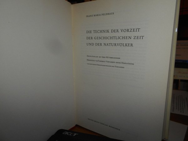 FRANZ MARIA FELDHAUS. Munchen, Heinz Moos Verlag, 1965. Die Technik der Vorzeit der Geschichtlichen zeit und der Naturvolker. In-8°, tela edit. con titoli al dorso e sovracopertina. 1440, 52, (7) pp. (numerazione pagine per colonne) con innumerevoli illustrazioni nel testo. In ottimo stato di conservazione o come nuovo. Uff. C - I - 4