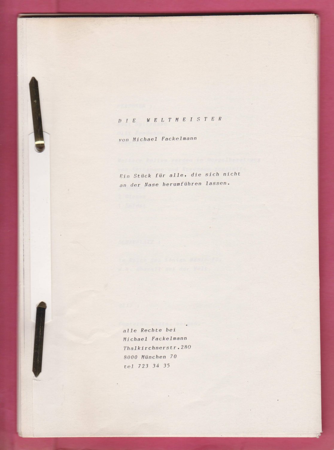 DIE WELTMEISTER, eine Parabel mit viel Slapstick zeigt den sinnlosen Kampf zweier Menschengruppen um die Macht. Das Drei-Personen-Stück für Kinder wurde als Straßentheater konzipiert & aufgeführt. (Schenda).